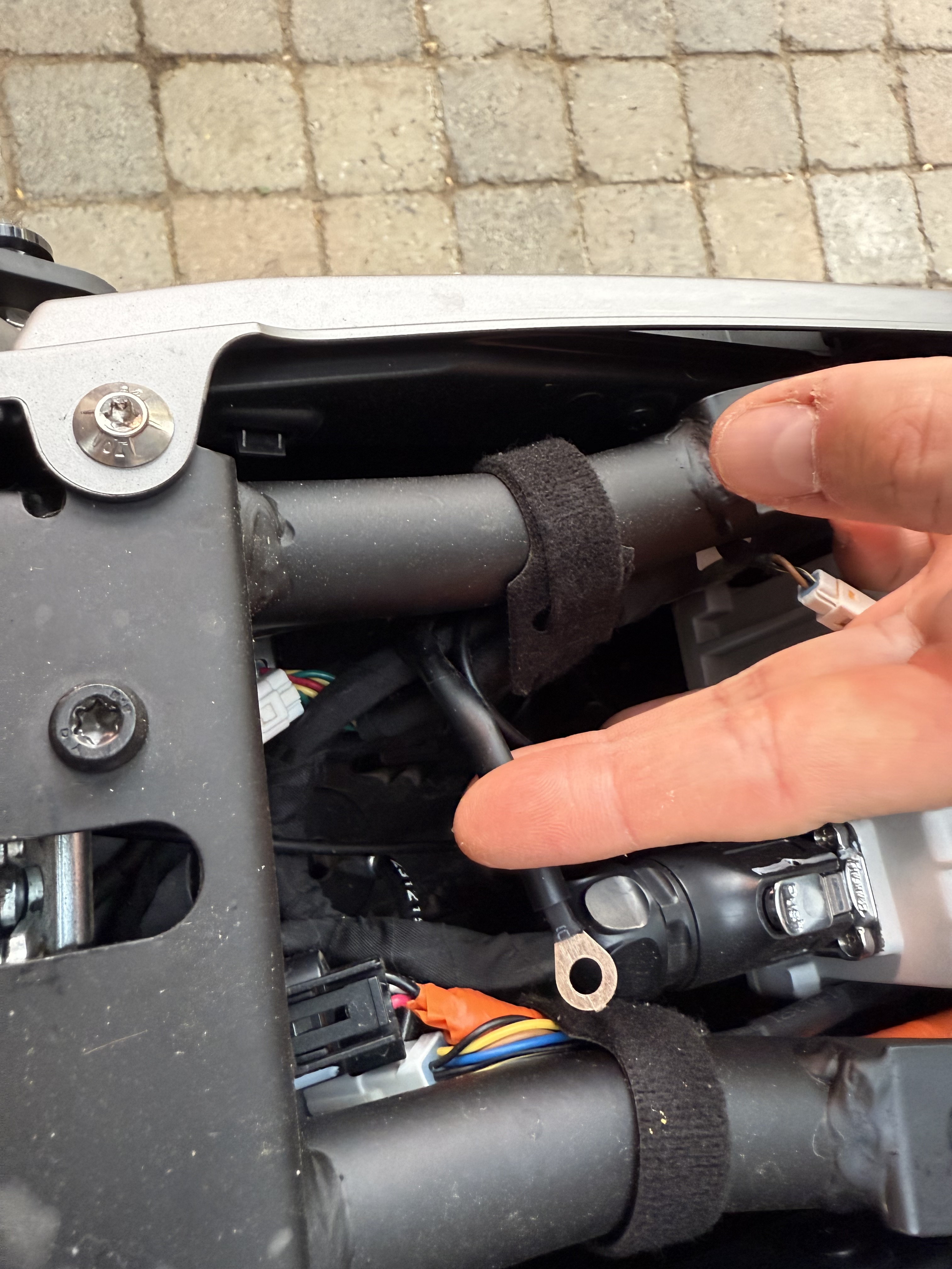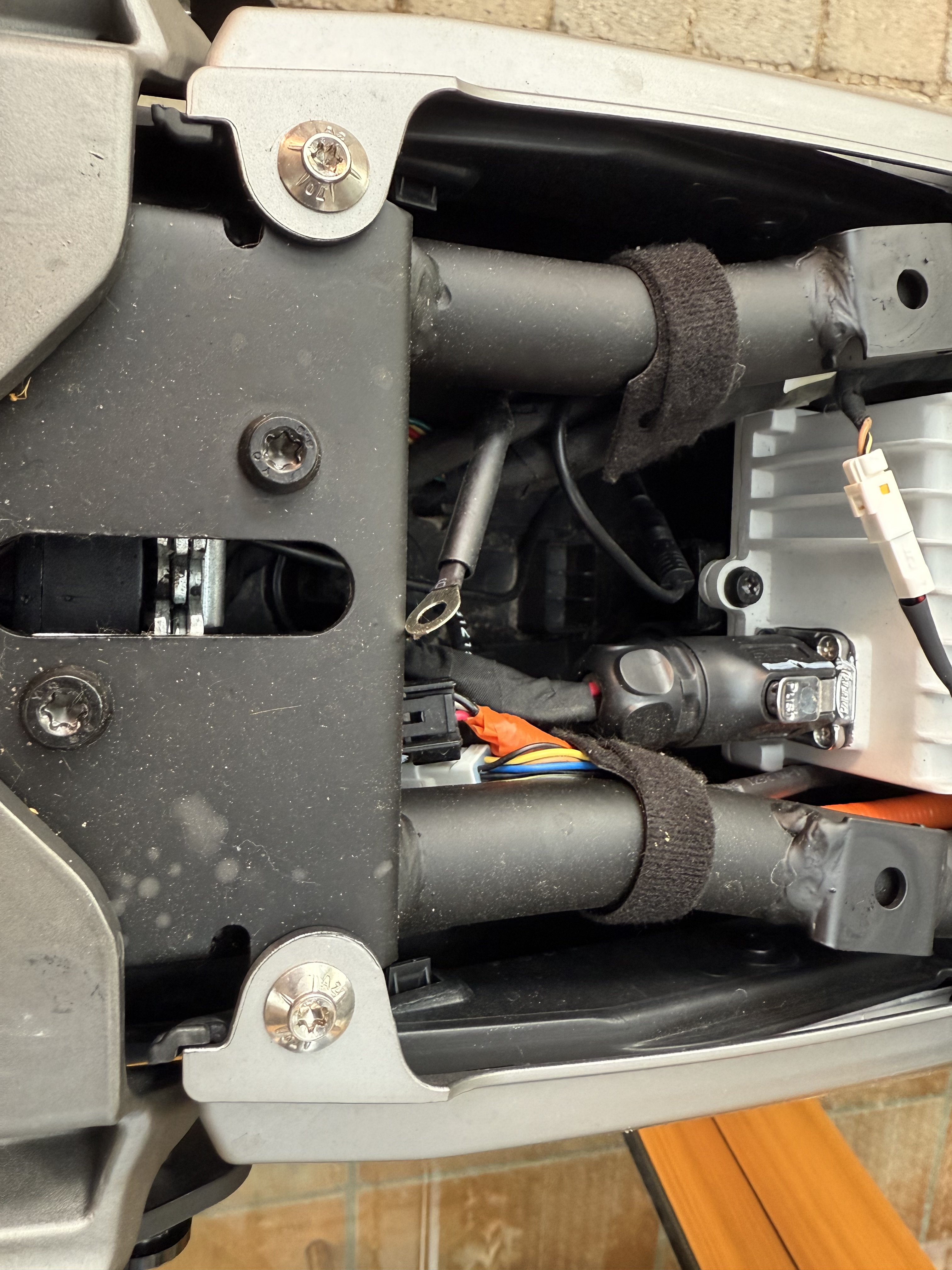 Im Bereich der Sitzbankverriegelung ist mir ein loses Kabel aufgefallen. Es kommt aus dem Kabelbaum der links vor dem Schloss am Rahmen befestigt ist.