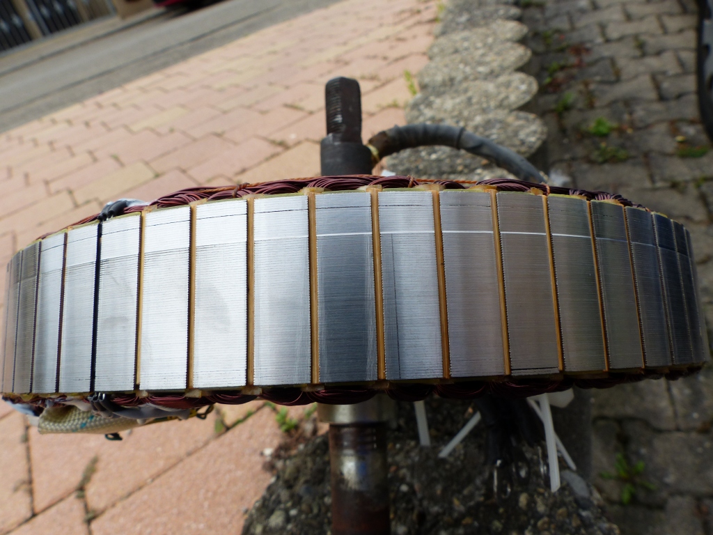 Hier ein Bild nach etwa dem ersten 10tel: Bis knapp zur Hälfte des Stators (rechte Seite) wurde hier erst Material abgetragen, und das Abgetragene war nur auf ca. 1/3 des Umfangs. Die Reibspuren selbst waren sonderbarerweise noch nicht vollständig angekratzt, und um Rundlauf zu erhalten mussten wir rechts etwas mehr abnehmen, so dass es jetzt eine kleine Stufe im Stator gibt. Nach Engraten der 63 Zwischenräume mit gefaltetem Schmirgelleinen sah das Ergebnis dann so aus: Da fehlt jetzt natürlich ein Menge Material, d.h. der Luftspalt wird erheblich größer als bislang. Wobei er ja teilweise kleiner 0 war vorher
