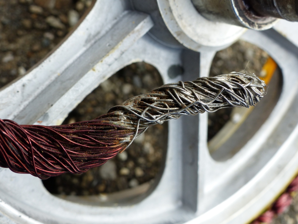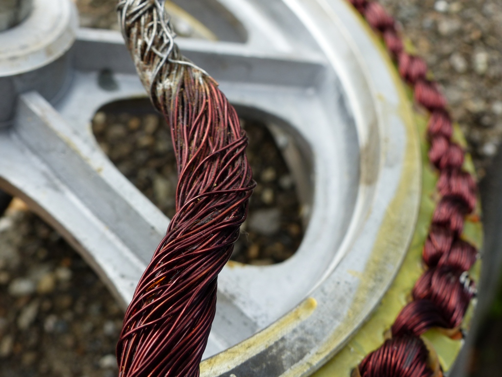 Jetzt erst machte ich mich ans Entkleiden des Sternpunkts, aber was darunter zum Vorschein kam war verhältnismäßig unspekatakulär: die letzten ca. 60mm vom Bündel der drei Phasenenden war irgendwie (vielleicht chemisch? Oder doch nur thermisch?) seines Lacks entledigt worden und das ganze mehr oder weniger großzügig in Lötzinn gebadet: Der heiß gewordene Teil war noch mit Lack isoliert und sieht eigentlich nicht wirklich auffällig aus, außer vielleicht etwas angekokelter Lack tiefer drin im Bündel: Ich vermute, die Hitze staute sich genau dort, wo der Kabelbinder das noch lackisolierte Litzenbündel zusammengequetscht hatte. Ich habe daher nach wieder Einhüllung des Sternpunkts das sowieso schon per Lötzinn verbundene Ende mit einem neuen Kabelbinder an die Statorspeiche geklemmt.