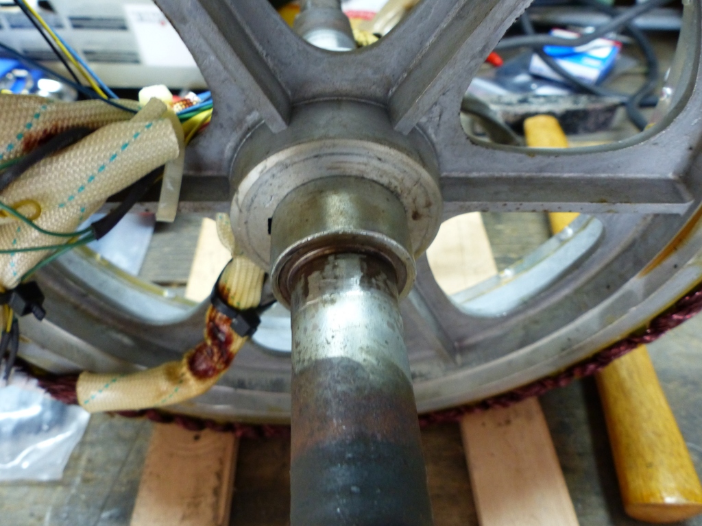 Felge/Rotor aufheizen war als nächsstes dran. Der Lagersitz auf der Kabelaustritts-Seite der Motorwelle war mit genau Ø15,00 schon so i.O.