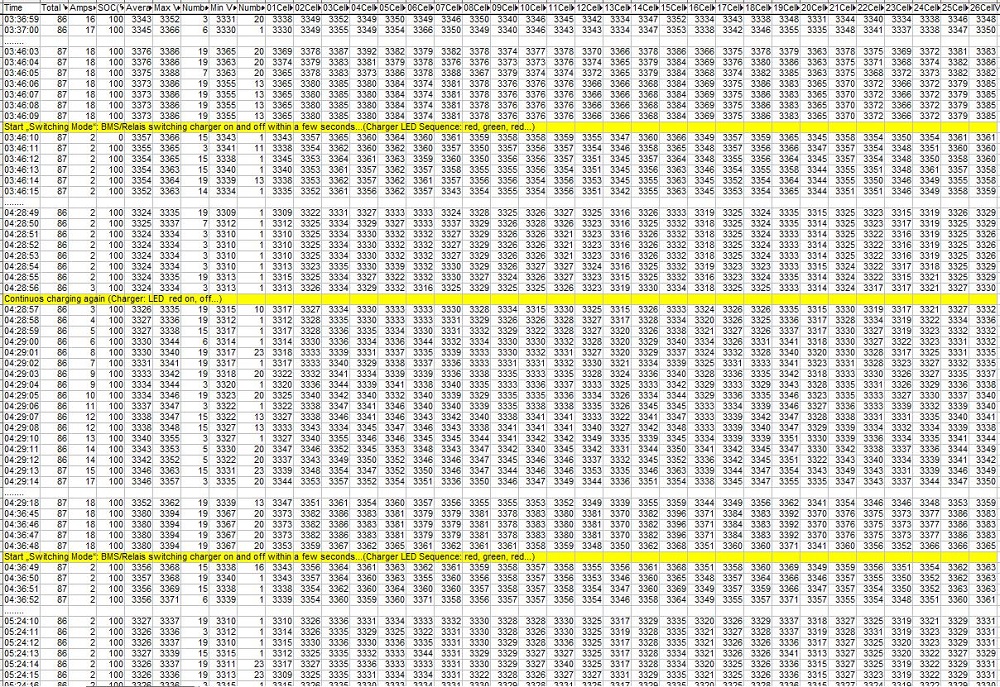 Eine Sache, die ich am BMS des Puma schätze ist das Monitoring der Zellspannungen. Bei angeschlossenem Laptop wird automatisch eine csv Datei erzeugt. Die ist sehr aufschlussreich, auch wenn ich schon Messfehler von zumindest 0,2 V entdeckt habe.