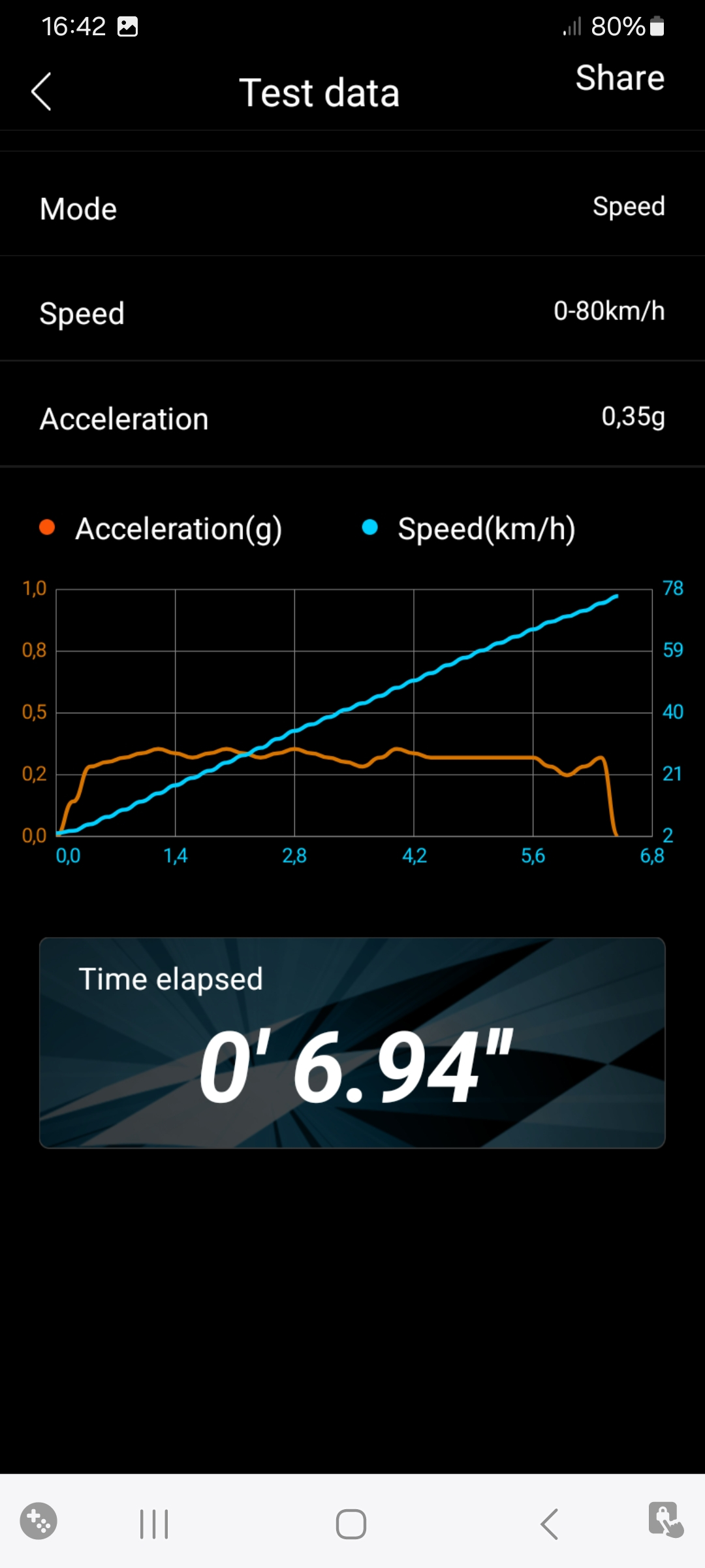 Der Motor war nach 10 Durchgängen bei 55 Grad. Vorher war da schon das Limit von 140Grad erreicht. Mit mehr Phasenstrom beim anfahren und ggf. mehr Batteriestrom sollten unter 8 Sekunden bis 100 nun realisierbar sein.
