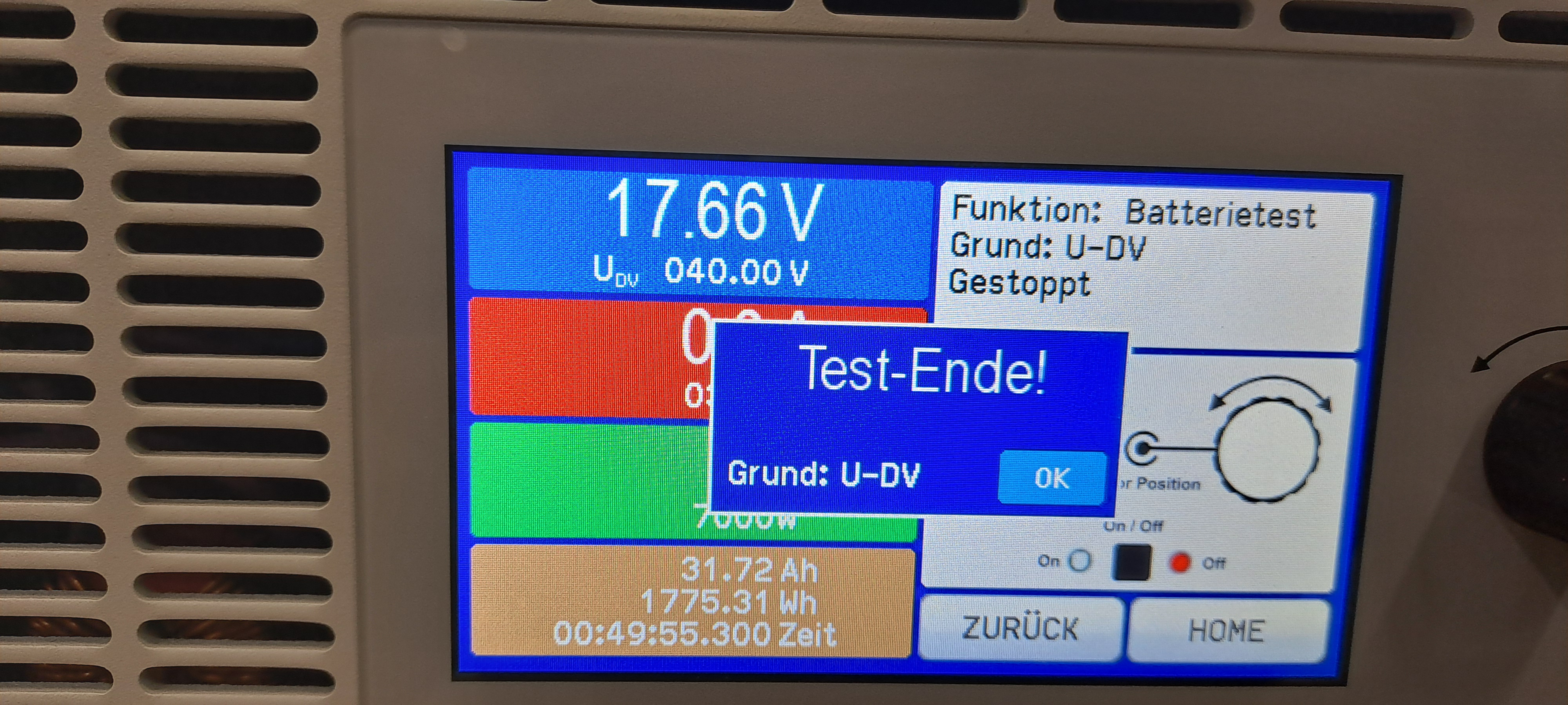 Der etwa 3 Jahre alte Akku wurde nach dem anfüttern eines Lasttest unterzogen bei dem er mit 1C Belastung noch knapp 32Ah abgegeben hat, von ursprünglichen 38Ah aus dem Prospekt. Dabei zeigte keine Zelle, auch nicht die angefütterte, Auffälligkeiten.