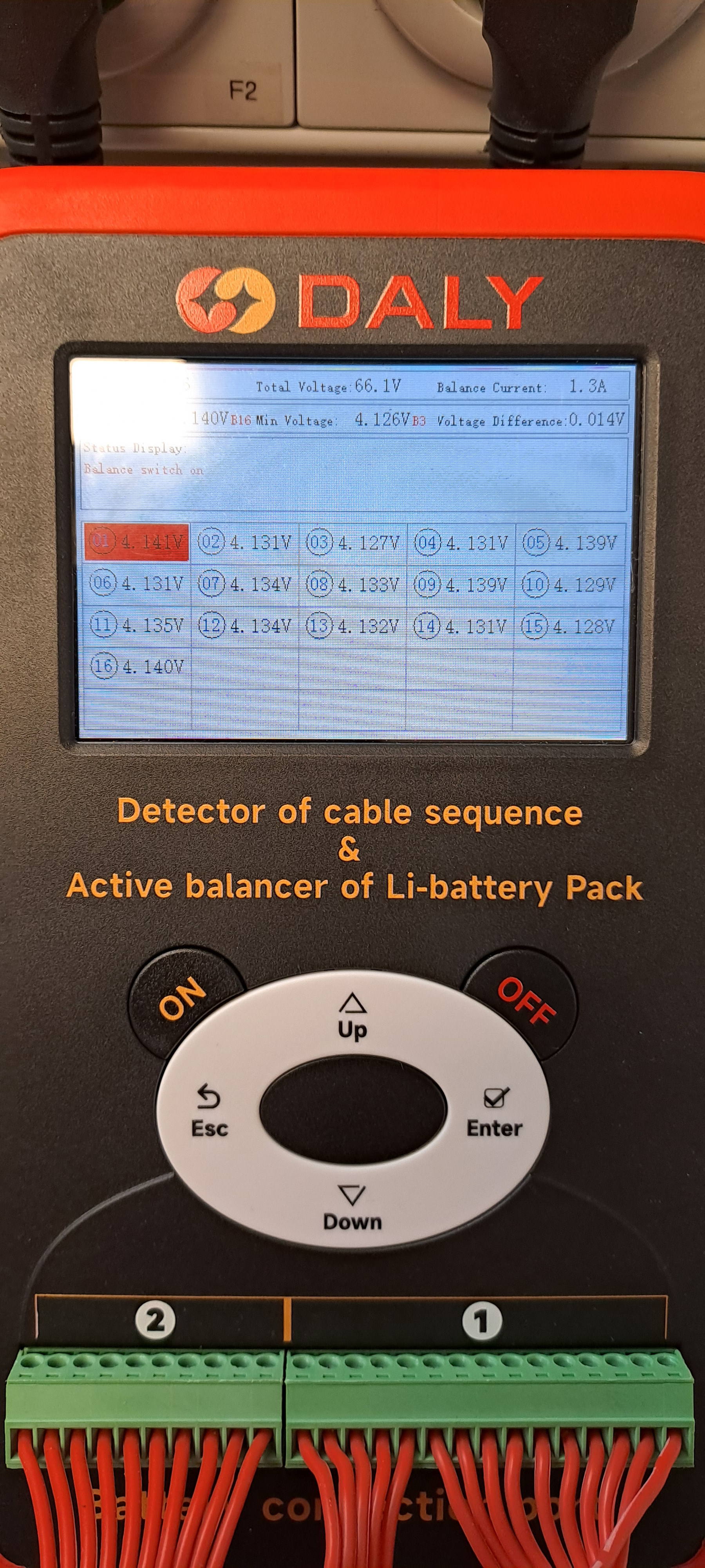 externer aktiver Daly Balancer (einstellbar von 1-10A) sich ums balancieren kümmert, mit eingestellten 1A Balancerstrom sieht alles top aus. Das Teil von Daly ist echt klasse, auf das mitgelieferte Adapterboard passen die gängigen Balanceranschlüsse, somit ist das "plug and play".