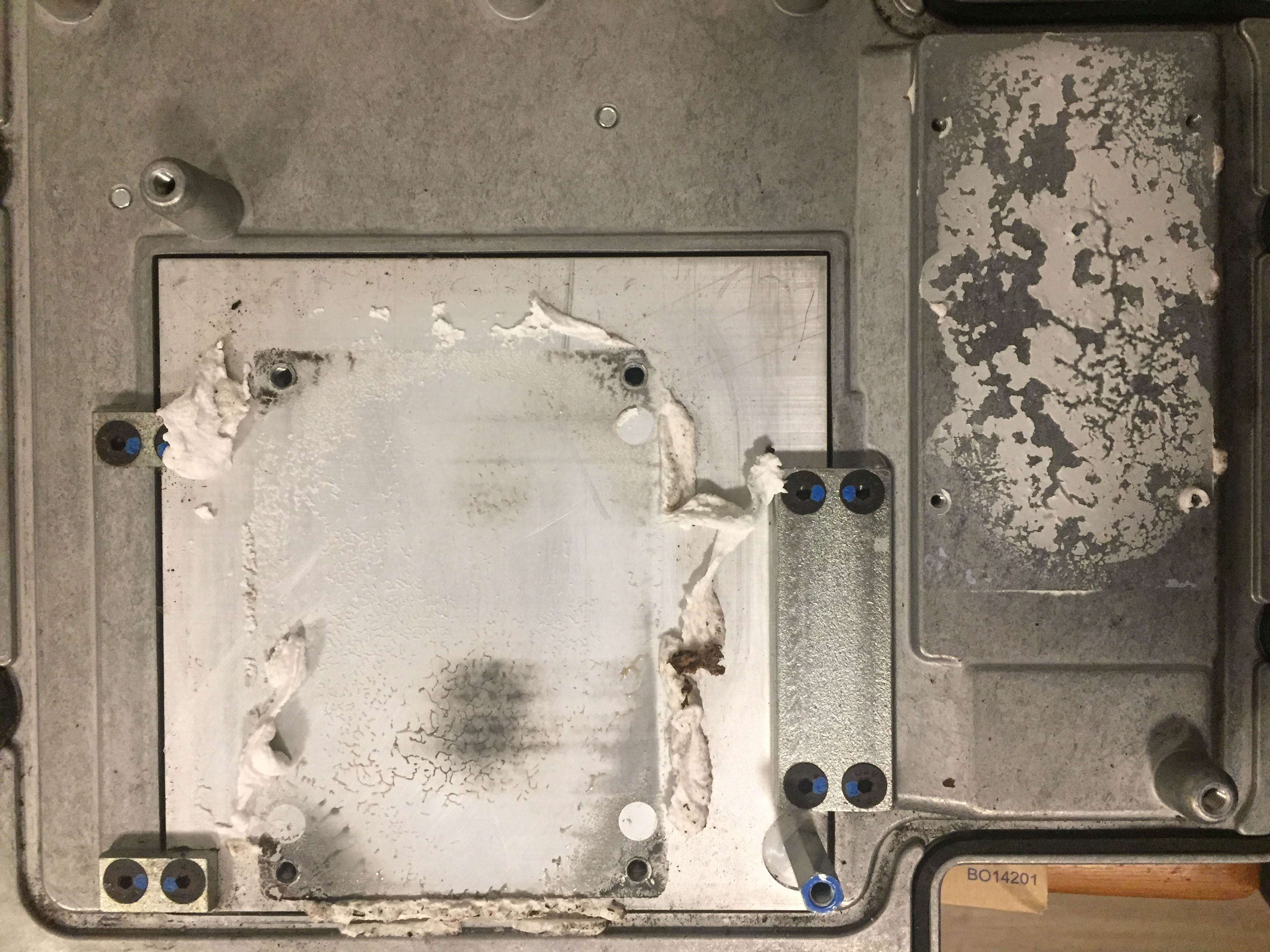 Die Wärmeleitpaste war wohl suboptimal verteilt/rausgequollen. Rechts das kleinere Modul ist übrigens der 12DC. Bei Vectrix ist wirklich alles anders gelöst.