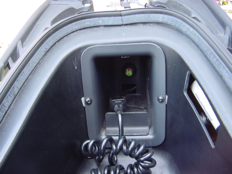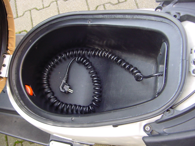 Hier Helmfach mit rotem Knopf links unten, und das Ladekabel kommt von hinten aus seinem Fächlein: