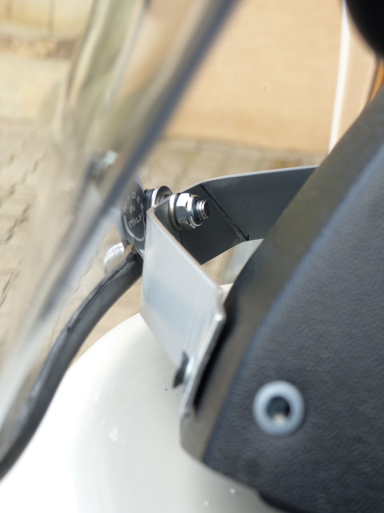 Noch im Ort fängt auf einmal mein selbstgeformter Alu-Windschildbügel an, wüst auf die Armaturenverkleidung zu schlagen, und das Geräusch einer losen Schraube, die jederzeit abfallen möchte, war auch klar zu vernehmen. Ich hatte es zwar eilig, um vor 18 Uhr (Zapfenstreich beim Händler) anzukommen, und es war ja trotz dem Gestürme 34°C heiß, aber ich ich musste doch sofort anhalten und nach dem Rechten sehen: aber nein, die linke Schraube hatte sich sowas von komplett gelöst und war kurz vor dem auf die Straße purzeln :shock: