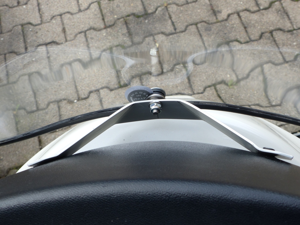 Mit einen Nachteil der mittleren Zusatzbefestigung muss ich allerdings leben: ich musste das Windschild so tief wie möglich auf seinen Haltebügeln fixieren, um Mitte unten mit meinem schon kräftig nach oben greifenden Eingenbauhalter noch genügend Windschild für Gummitülle und Befestigung zu haben.