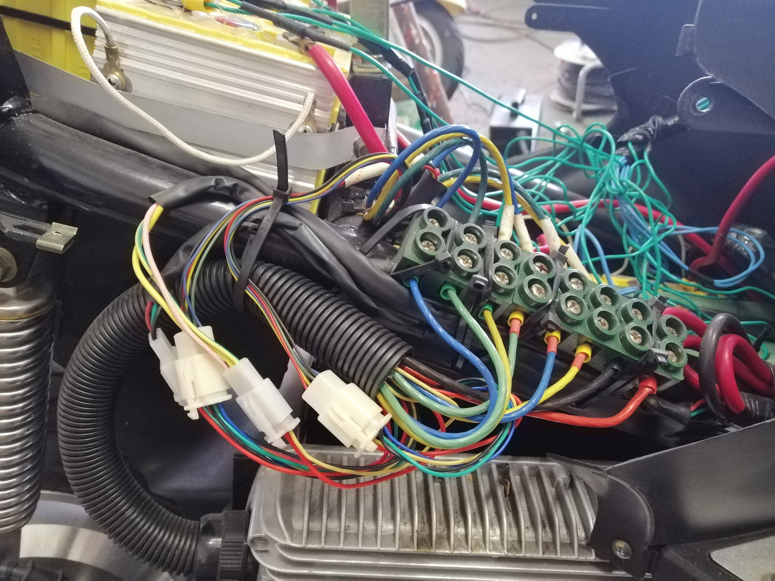 Da gehen 6 dicke Phasenkabel (Phase A, B, C und U, V, W) zum Motor und der Motor braucht auch einen doppelten Satz Hallsensorleitungen (die ganz dünnen Käbelchen, mindestens 2x5=10). Die Mittelgroßen Kabel sind die Leitungen zur Ansteuerung, Power-Cut-Off (z. B. beim Bremsen) sowie Signalleitungen zum Cockpit. Eine der Dreier-Verbindungen ist das Kabel vom Gasgriff mit drei Adern, wo die 5 Volt ggf. von oben (Akkuspannung) gemessen werden müssen und eine Leitung das Griff-geregelte Signal hat. Ich vermute der Stecker mit dem Grün/Gelb-Kabel ist der mit Cut-Off, da dies bei mir die Cut-Off-Ader ist.