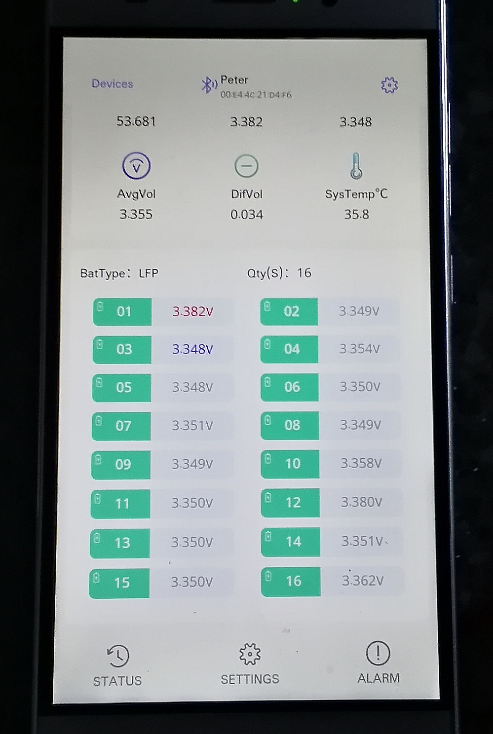 Aktives BMS mit Blauzahn - App läuft auch schon, nun bei der ersten Ladung ab 3,3 V / Zelle.