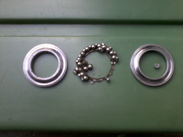 Da sieht etwa so schlimm aus wie das von einem leichten Frontaufprall zerdepperte Lenkkopflager meiner früheren Aprilia. Das Fahren damit bis zum Händler (mehr traute ich mir nicht mher) war die anstrengendste Fahrt meines Lebens, noch einiges Schlimmer als die vielleicht 4 Blitzeisfahrten bisher... Man kommt sich vor wie der blutigste Anfänger, der zum ersten Mal mit über 40 auf einem Zweirad sitzt. Die völlig in Fleisch und Blut übergegangenen inutiven Mikro-Lenkerbewegungen zum Gleichgewicht erhalten funktionieren überhaupt nicht, weil der Lenker sich schlicht NICHT bewegt. Man muss also willentlich Kraft aufwenden, um die Kugelstapel so weit zu verschieben, dass das Vorderrad den nötigen Schwenk macht, dann aber natürlich in höherem Maß als erforderlich, und man dann wieder willentlich gegenlenken muss. Das ist potentiell lebensgefährlich und nicht zur Nachahmung empfohlen. ADAC Straßendienst anrufen mit Bitte um Transport zur Werkstatt wäre eine wesentlich gescheitere Methode, oder man ist selbst in der Lage, diese Unbill zu beseitigen, wie Alfons