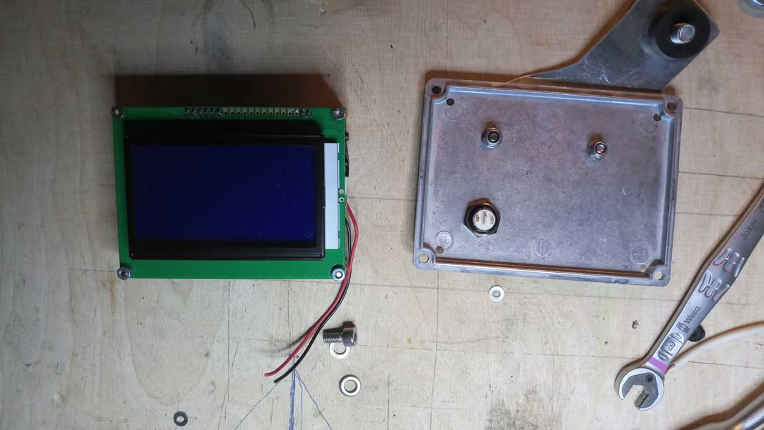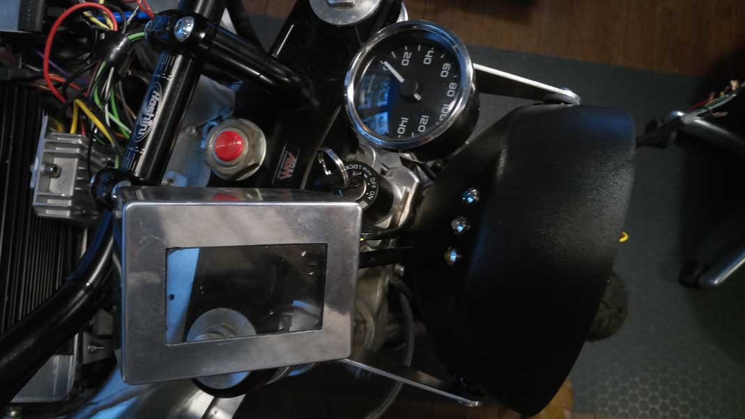 Hat ne Weile gedauert, das BMS-Dsiplay in eine schöneres Gehäuse zu bauen. Ein wenig klobig neben dem runden Daytona-Tacho. Hab dann eine Modem-Kabel Verlängerung hergenommen. Das schöne dabei ist, dass der Hall-Ausgang des Kelly sowohl das Display also auch den Tacho versorgt, so war kein extra Geber am Rad nötig.