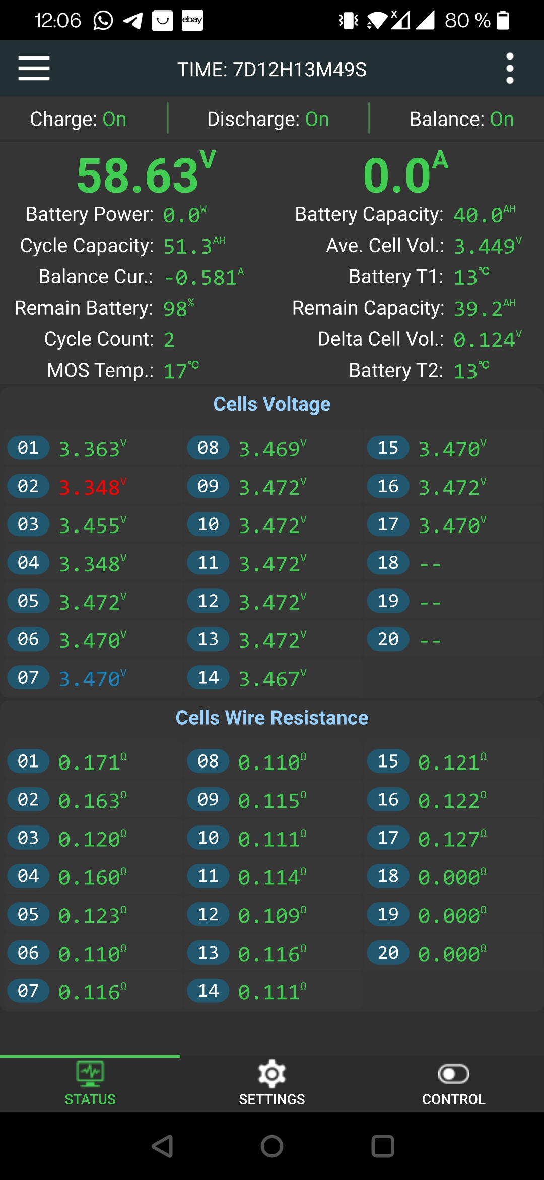 Leider hat das JK BMS zu wenig Zeit gehabt, alle Zellen auf einen Level zu bringen. Früher begann man eine Neuinstallation mit einer Initialladung. D.h. alle 17 Zellen parallel schalten und mit 3,65V laden, was wenige Tage dauern konnte.... Auch morgen Früh werden die Zellen 1 + 2 noch hinterher hängen, leider.