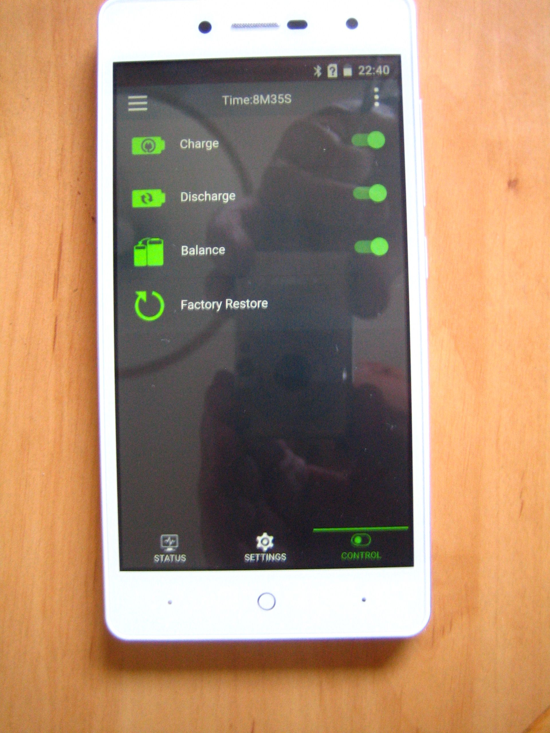 Die Spannungen, die ich angezeigt bekomme, sind etwa 80 mV zu niedrig, so wie bei Peter auch. Abgeschaltet wird bei 3,6 V (3,68 V mit der Messungenauigkeit), das klappt ganz ordentlich. Leider lässt sich der Wert nicht umstellen?! Sobald ich etwas anderes (z.B. 3,5 V) einstellen will, werden sofort 4,25 V eingetragen...