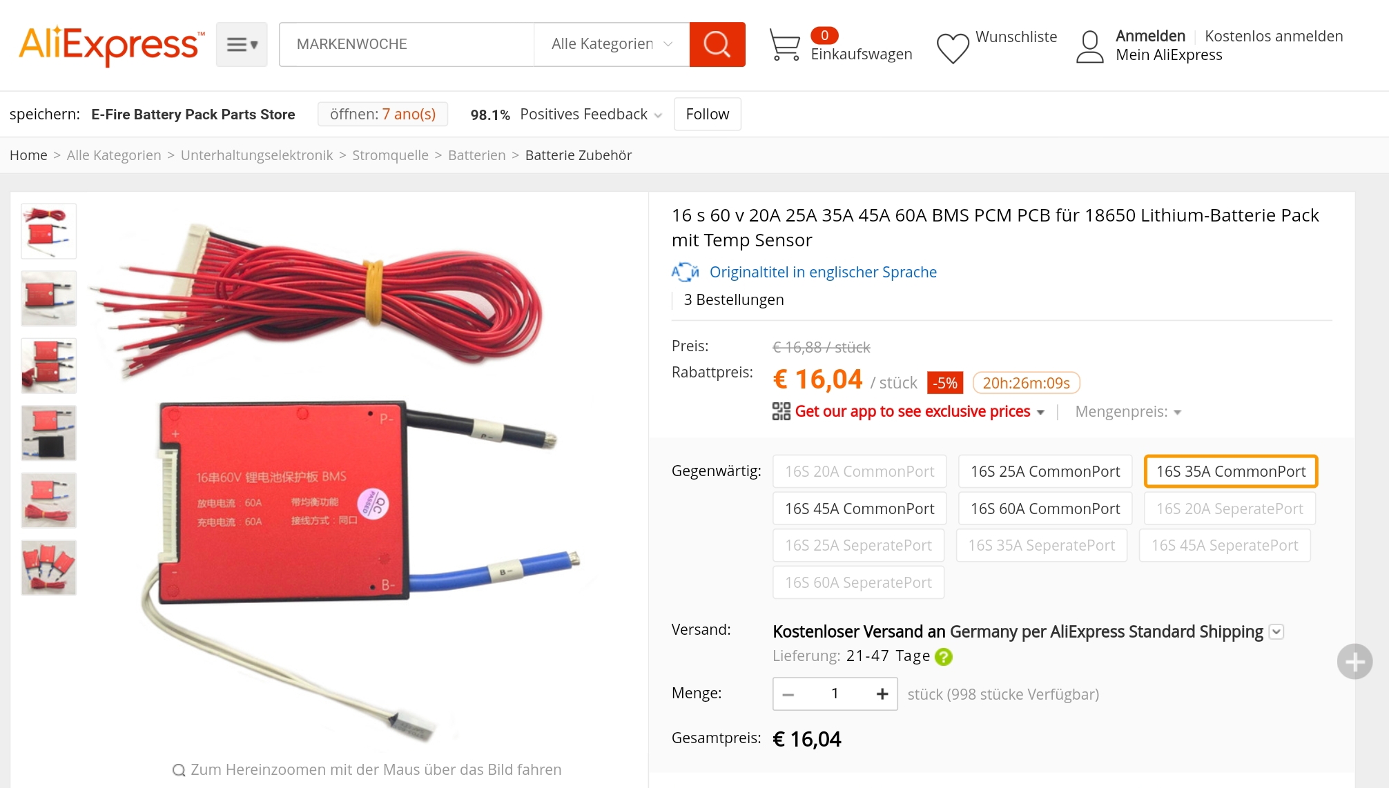 Einfach bei google 'aliexpress 16s bms' eingeben. Gegebenenfalls noch Worte wie smart oder bluetooth hinzufügen. Neu bei aliexpress ist, dass neben Email Adresse und password man eine Email erhält mit 6 Ziffern. Diese 6 Ziffern muß man bei der Bestellung eingeben. Und natürlich auf die Chemie achten, 3,7V bzw. 4,2V.16 s 60 v 20A 25A 35A 45A 60A BMS PCM PCB für 18650 Lithium-Batterie Pack mit Temp Sensor
