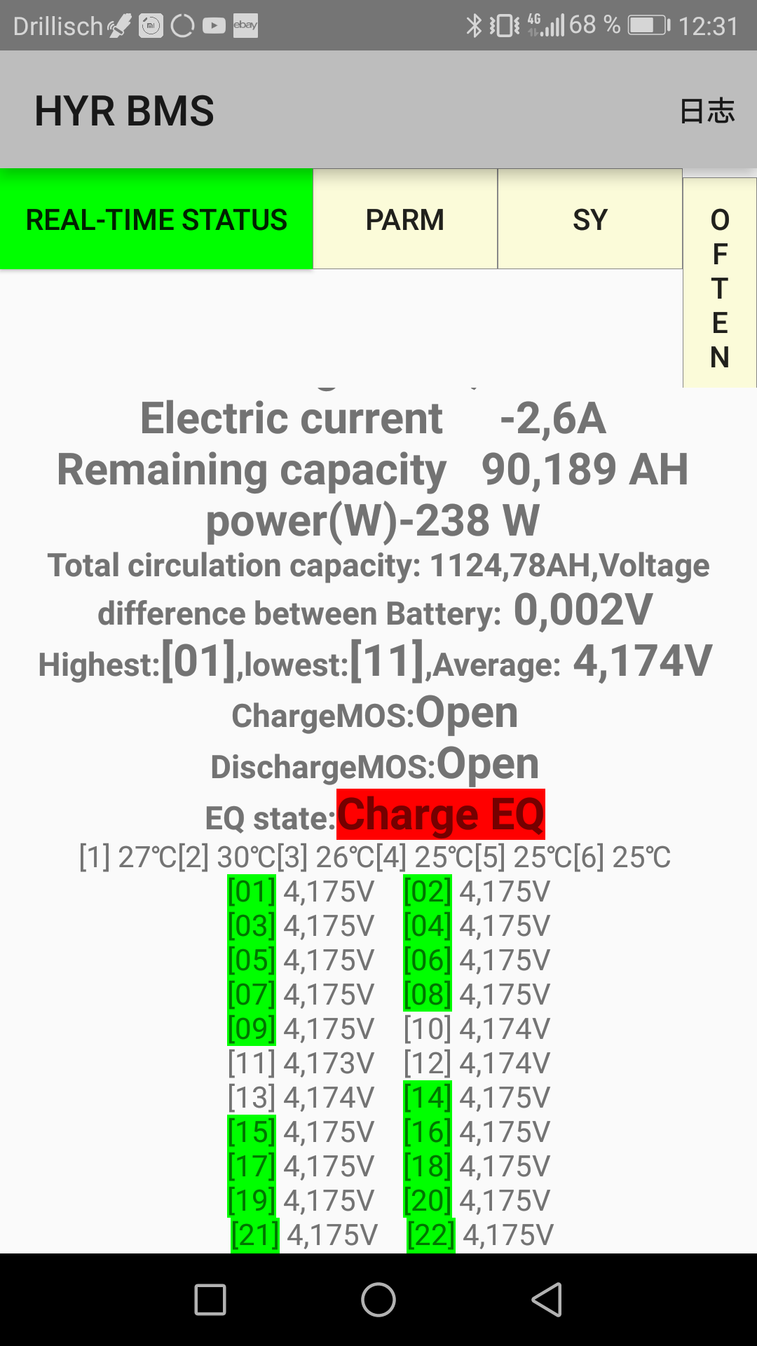 Hier sieht man schön, dass der Balancer arbeitet, (charge EQ rot hinterlegt) Zellenspannungen die grün hinterlegt sind werden balanciert.