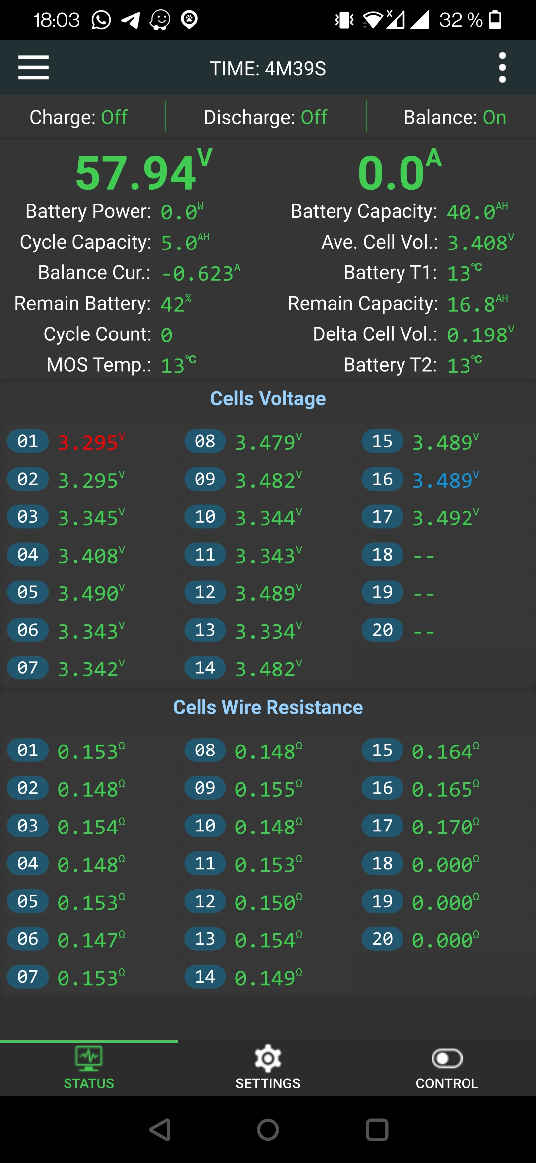 Ich vermute, dass die Cell Wire Resistance auch den Innenwiderstand der Zellen messen. Sieht bei dir aber gur aus. Bei Werten > 0,75mOhm fängt das JK BMS an zu meckern - balanciert nicht mehr.