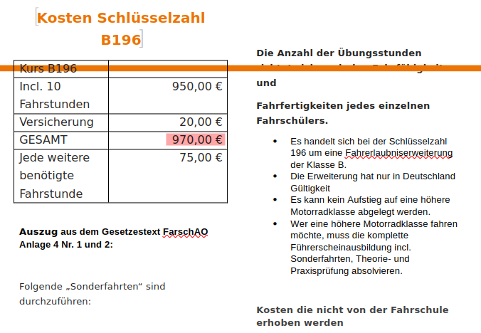 Zwei Jahre vorher (Mitte 2022), bei meinem ersten Anlauf, hatte vorgenannte Fahrschule noch 800 € dafür verlangt. Leider mußte ich damals wegen eines Pflegefalls in der Familie die Schulung vorzeitig abbrechen. Zwei Jahre später nun kostete die Schulung 880 €.