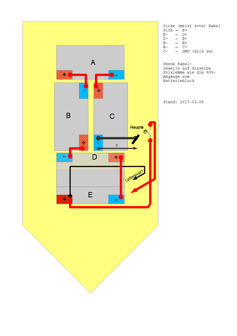 Meines Erachtens können die beiden dünneren Leitungen nur an denselben Polklemmen wie die 60V-Hauptleitungen angeschlossen sein, eine "Abzapfung" an einer einzelnen Batterie wäre nicht sinnvoll / möglich.