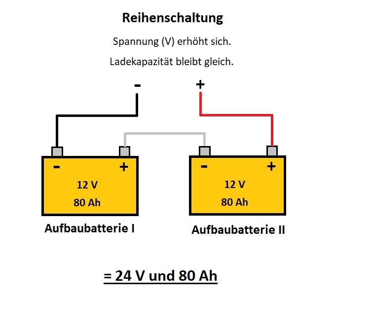 Entladen werden die beiden 12-Volt bzw. in LiFePO4 12,8 Volt-Blöcke aber nur bis 2x 10,5 Volt = 21 Volt.