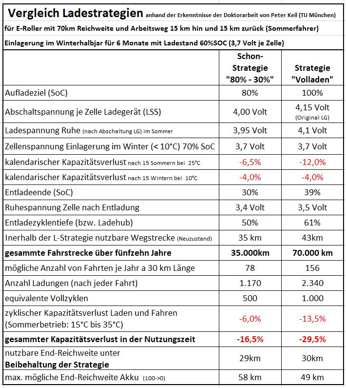 Die Frage, die micht interessiert hat, war die, wieviele 15km+15km=30km Strecken der Roller mit einem Akku schaffen kann (ohne Möglichkeit zum Nachladen am Arbeitsplatz), bis der Akku diese Reichweite nicht mehr erbringt. Und das innerhalb der Ladestrategie. Begrenzt man die Akkunutzung strikt auf 50% des Akkupotentials, kommt man in diesem Beispiel (Arbeitsweg 2x15 km) schon nach 500 Vollzyklen ans Limit. Falls man unterwegs (bei nachlassender Reichweite) die Ladestrategie wechselt, sähe der Vergleich natürlich ganz anders aus.