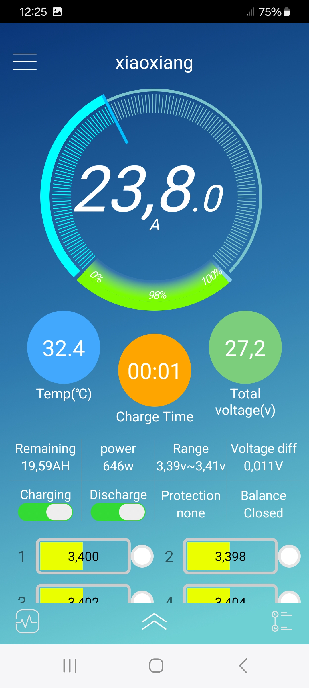 Das JBD zieht die Reißleine übrigens nicht direkt bei erreichen der eingestellten Spannung sondern erst 2-3 Messzyklen später, was normalerweise keine Rolle spielt aber hie standen zwischen den Screenshots mal kurz 3,73V in der Anzeige der höchsten Zelle.