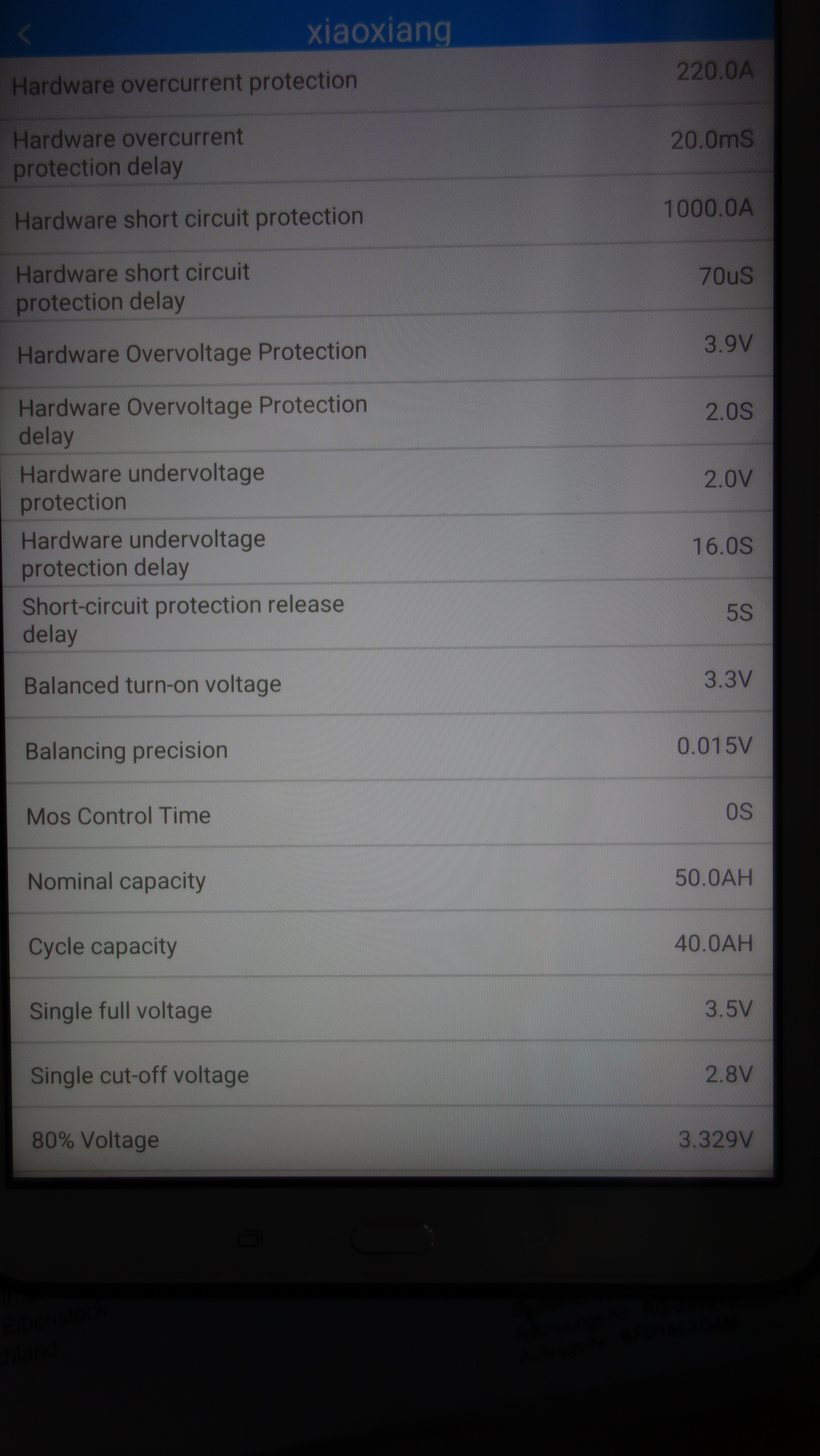 Ich vermisse dort Einstellungen zum Balancing. Das kann bedeuten, dass es diese bei Deinem BMS nicht gibt, Du keinen Zugriff auf diese Einstellungen hast (also auch kein "Read-Only") oder Du sie vielleicht auch einfach bislang übersehen hast.