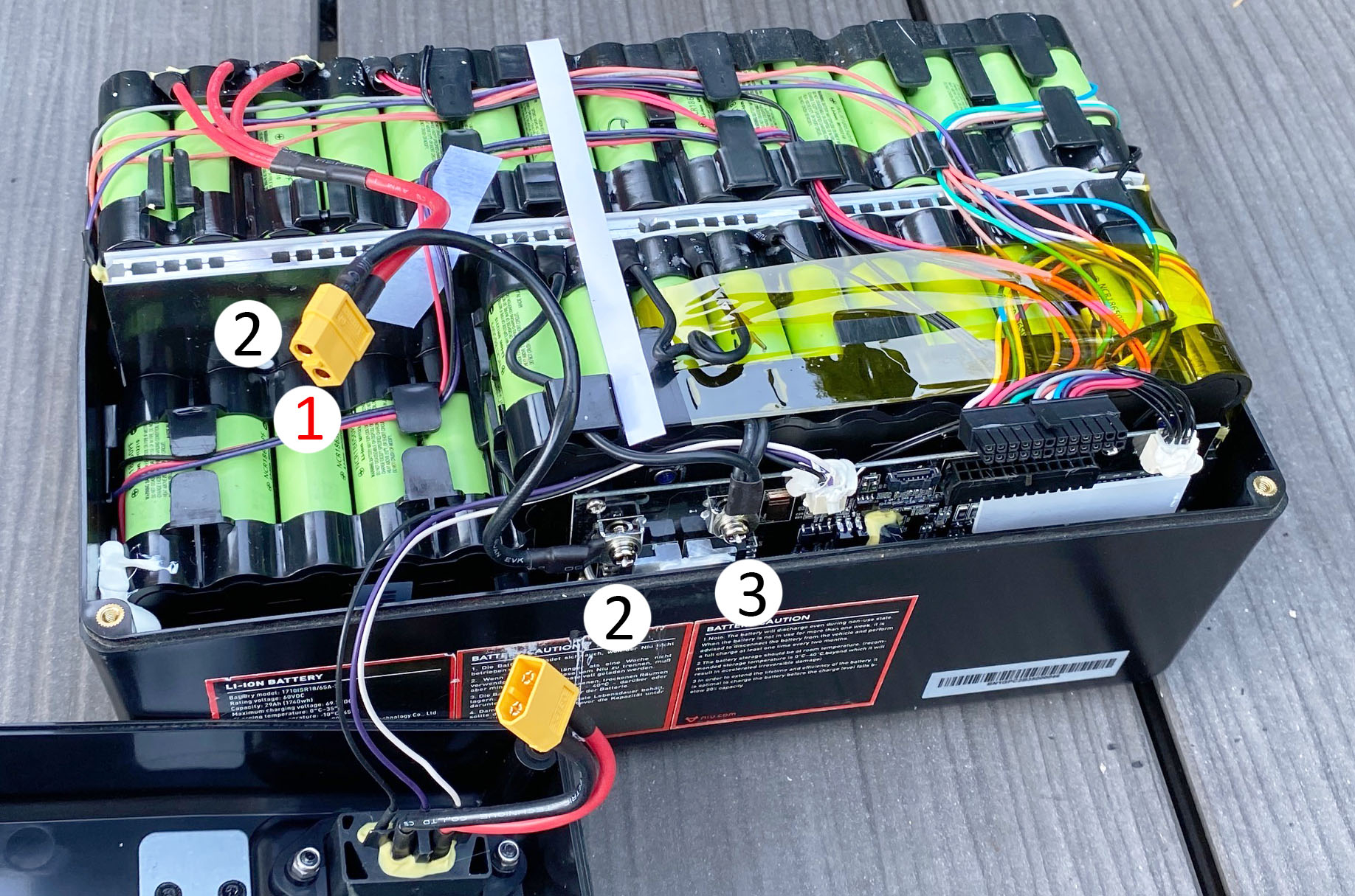 - Solange der breite Stecker abgezogen ist, sind am Akku zwischen + und - 68,5 V messbar (auf Foto 2 zwischen Pkt 1 und 3), am Stecker noch 66,3 V (auf dem Foto zwischen Pkt 1 und 2). Sobald der breite Stecker allerdings wieder im BMS steckt, bleibt der Akku zwar bei 68,5 V (Pkt. 1 zu 3 gemessen), aber am Stecker (Pkt. 1 zu 2) und damit zum Niu sind nur noch 38,5 V, was den Akku aus Sicht des NIUs offline erscheinen lässt.