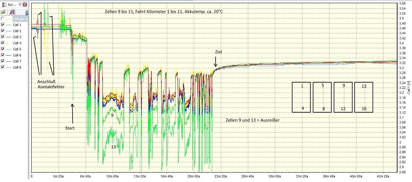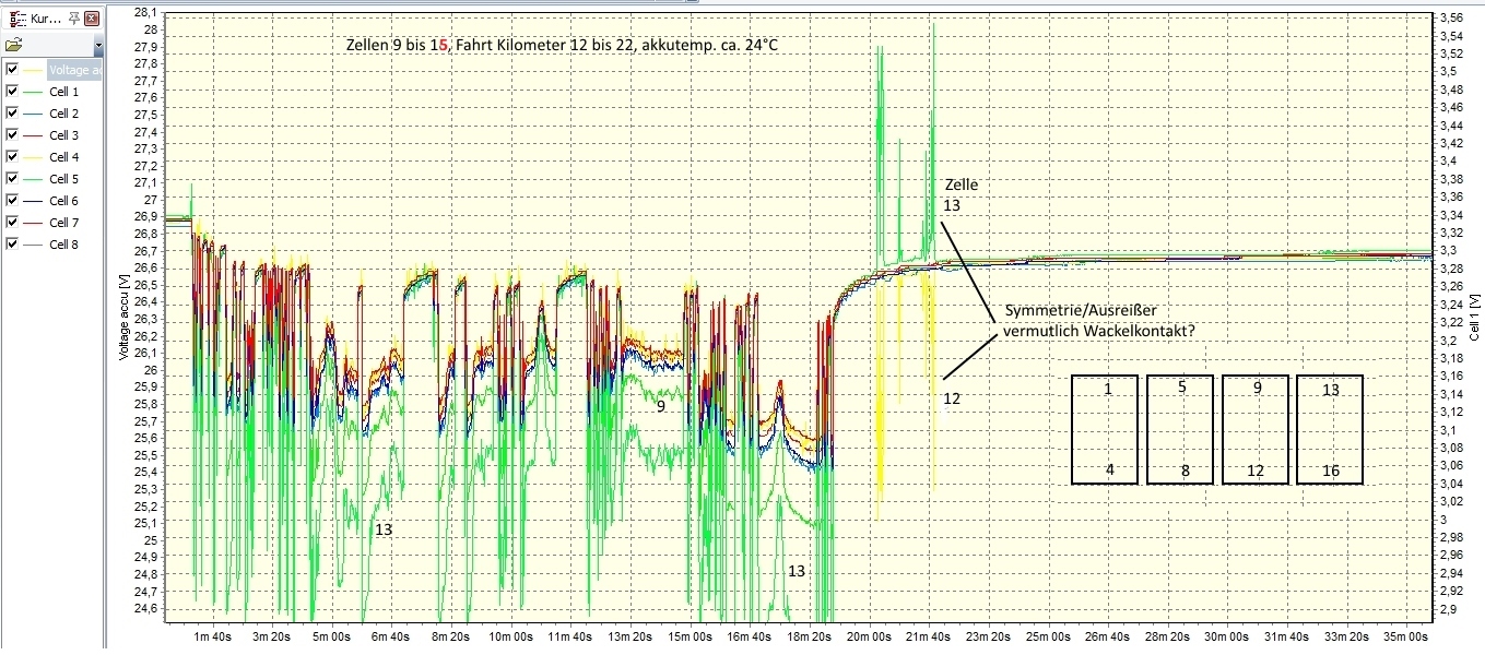 Zellen 1-8: Zellen 9-15 (16.Zelle nicht gemessen!): Hier noch die anschließende Volladung: mit Ausreißer nach oben(?) mit auffällig gezackter Ladekurve bei 2 Zellen (Wackler??)