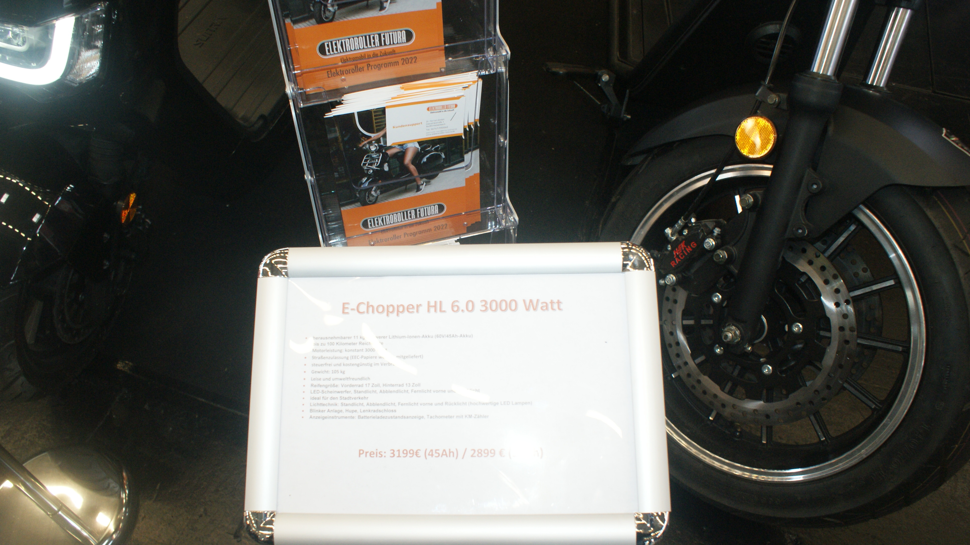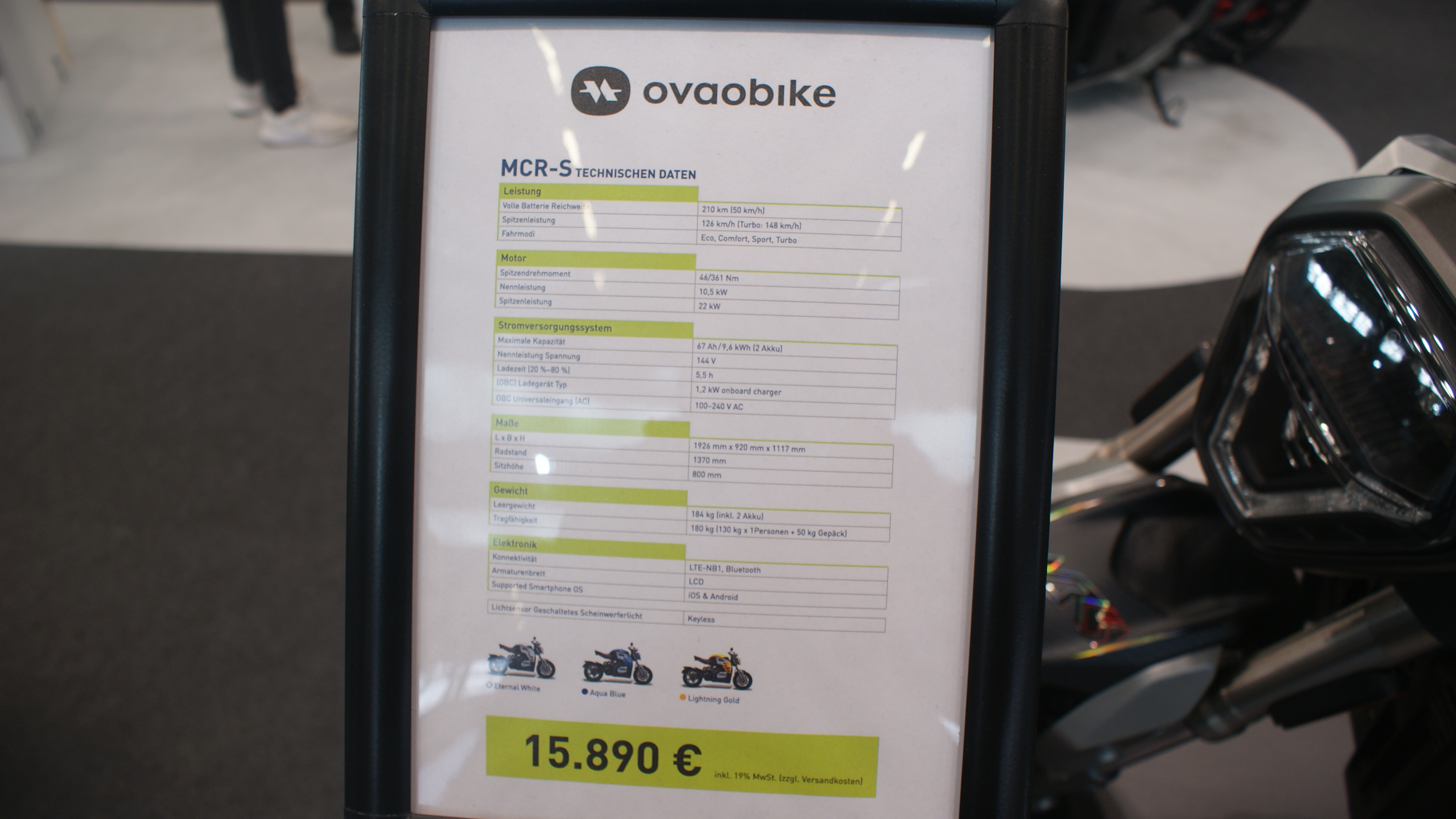 Fast hätte ich mir zum Messepreis eine MCR M von Ovaobike bestellt....(120 Km/h, mit Turbo kurzzeitig 130 Km/h, Reichweite bei 50 Km/h 230 Km)