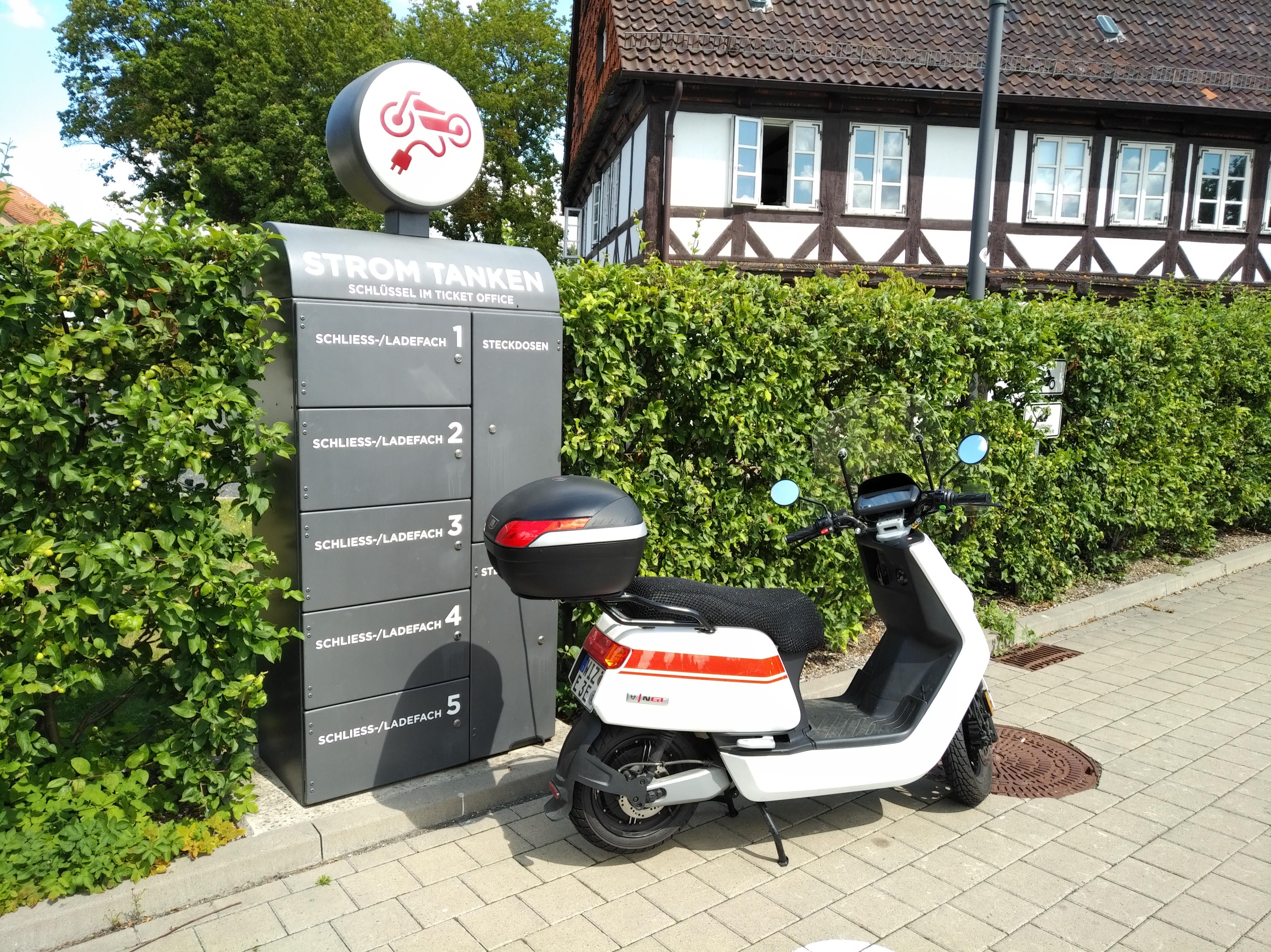 Am Haupt-Parkplatz befindet sich eine Elektro-Zweirad-Tankstelle mit Ladefächern und vielen Schuko-Steckdosen. Das Laden ist kostenlos, mit Öko-Strom. Man braucht keine App oder Ladekarte. An der Kasse gibt es die Schlüssel für die Fächer. Die Nachfrage scheint noch nicht sehr groß zu sein, daher habe ich die Akkus nicht entnommen, sondern direkt davor geparkt und das Ladegerät ins Fach gestellt.