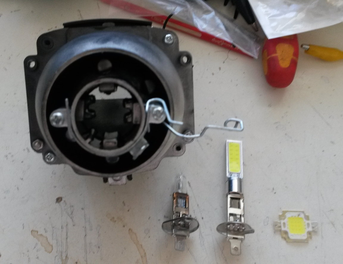 Die Birne vom Abblendlicht hat den Sockel H1, leider habe ich keine passende LED gefunden.