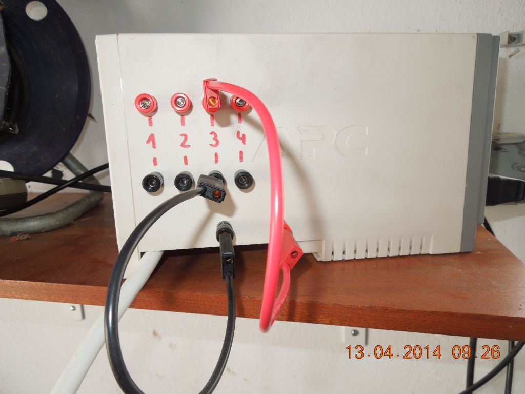 Darüber sieht man die KFZ-Dose mit einem weißen Kabel angesteckt, es geht von der Dose im Stauraum zu einer Lade-/Messstation, die im wesentlichen aus einer alten USV besteht. Die hatte keinen Akku mehr und lag bei mir noch rum. Ansonsten funktioniert sie noch und lädt die Akkus auf eine Endspannung von 13,5 V. Über die beiden Buchsen am unteren Gehäuserand hab ich den Ladeanschluss rausgeführt und kann ihn mit den beiden Laborkabeln auf jeden einzelnen Akku stecken. Auch die Spannungsmessung der einzelnen Akkus ist damit kein Problem. Die im Bild angezeigten 13,3 V hatte ich nachdem der Meanwell-Lader einen Tag zuvor abgesteckt und der Roller nicht bewegt wurde. Größte Abweichung zwischen den einzelnen Akkus zu diesem Zeitpunkt 0,06 V.