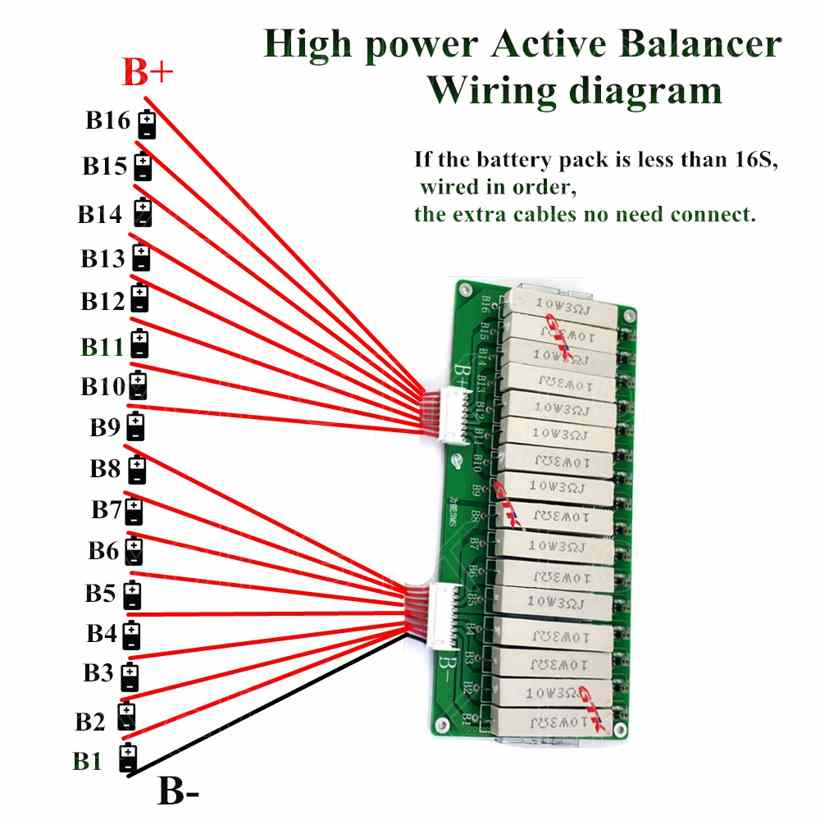 Ein Roller der gefahren wird, muß auch wieder geladen werden. Ich hatte noch ein 16-fach LiFePo4 Lastmodul, welches ich nunmehr montiert habe. Jede Akkuzelle hat ein Siegel mit Seriennummer - auf dieser Seite ist Plus. Die Ansprechschwelle beträgt 16 * 3,6V = 57,6. Die maximale Ladespanung sollte 0,8..1,6V niedriger sein.