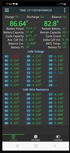 Ich lade aktuell mit bis zu 80A und das JK 2A BMS kriegt das locker hin. Im nächsten update geht es Richtung 120A Ladestrom, Endausbau könnte ich 150A-180A Ladestrom realisieren. Entladen wird im Moment mit bis zu 280A, nächste Stufe wird Richtung 350A gehen, gerne hätte ich noch deutlich mehr. Mehr kann JK aktuell leider nicht und den offenen Platinenstapel von ANT mag ich eigentlich nicht mehr haben.