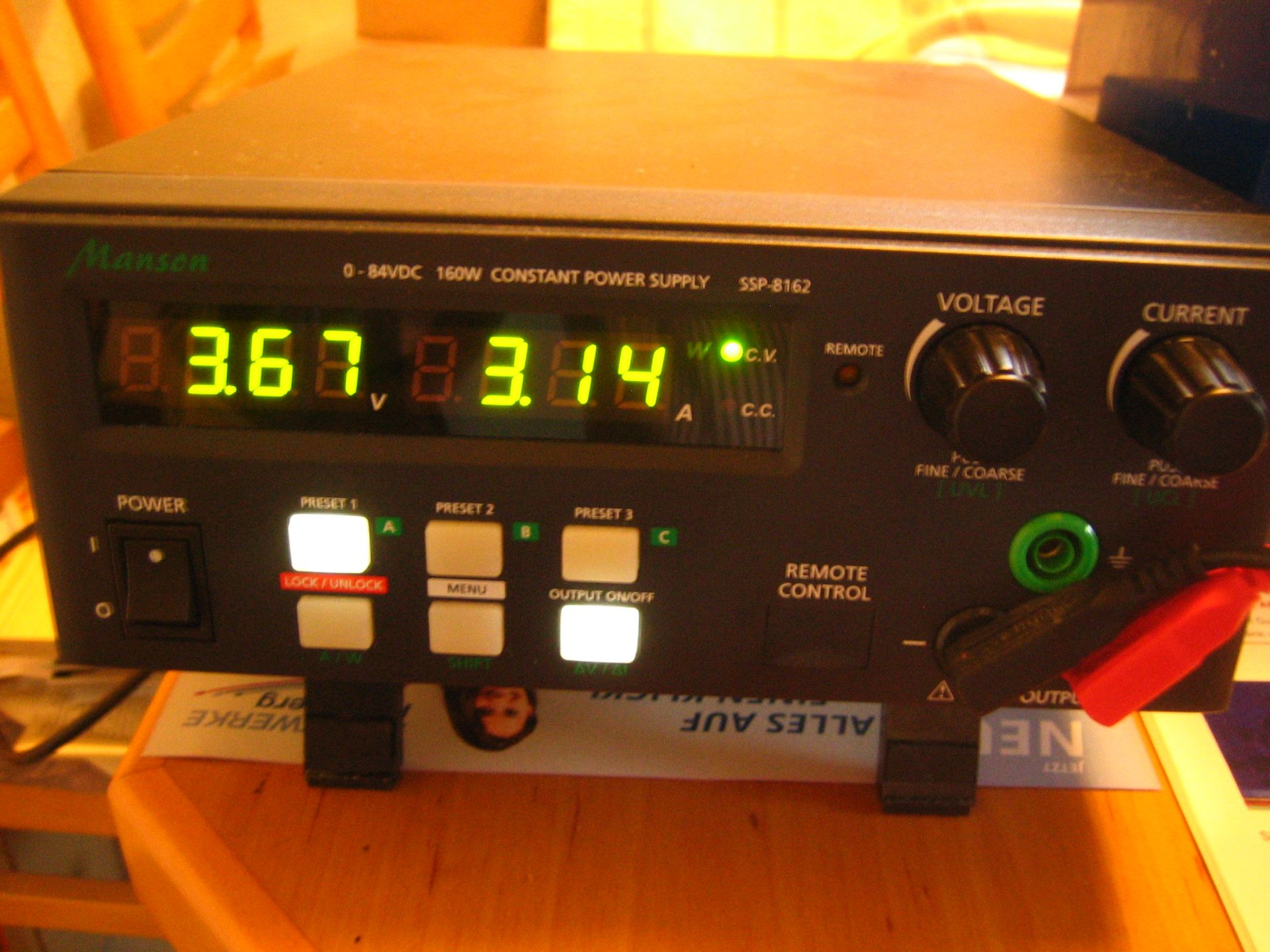 Sieht so aus: Am WE habe ich meine nachgelieferte Zelle mit 30Ah auf geschätzte 95% Ladung gebracht. Bei 3,4V Zellspannung und 3,65V flossen 2,5A der möglichen 5A am Labornetzgerät (d.h. 0,25V Spannungabfall auf den Leitungen). Am nächsten Morgen hatte die Zelle 3,33V.
