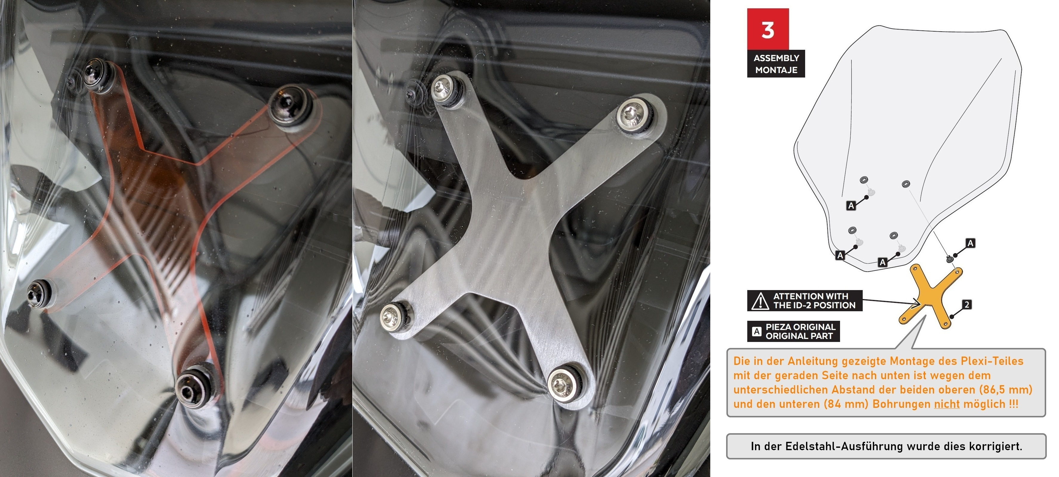 Sicher gibt es Verwirbelungen (Größe 181cm, SHOEI Neotec 3), aber gegenüber dem kleinen Schild eine wirkliche Verbesserung. Bei der Montage ist mir aufgefallen das der orangene Distanzhalter falsch gebohrt ist und entgegen der Montageanleitung auf dem Kopf stehend montiert werden muss. Da mir das Kunststoffteil nicht gefiel hat ein Freund anhand meiner Skizze ein Laserfile erstellt und ich habe mir ein X aus Edelstahl lasern lassen. Für meinen Geschmack sieht das schöner aus.