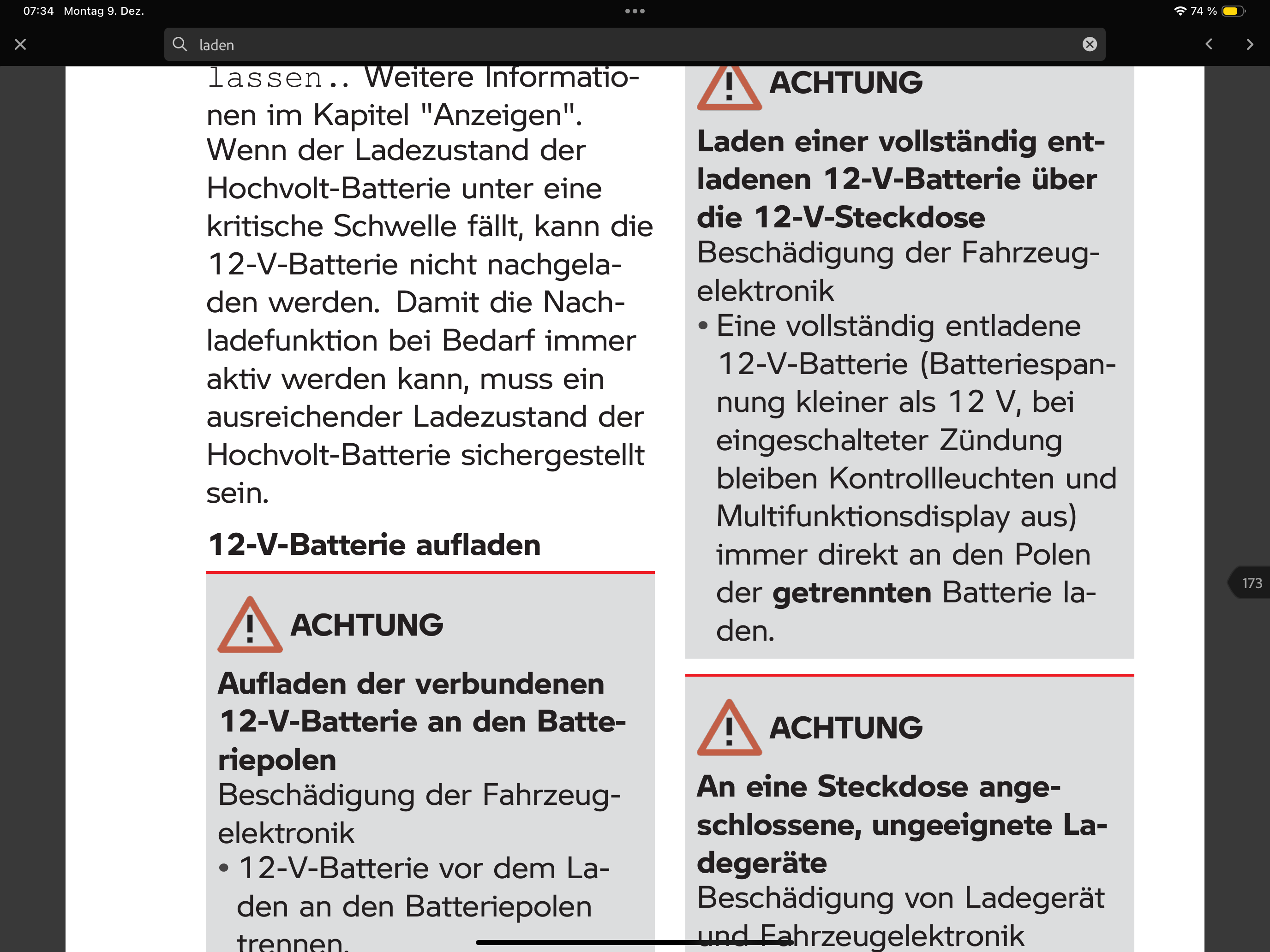 Mir geht es hier erst einmal darum sicherzustellen, wie man am besten und „regelkonform“ die 12V-Batterie auflädt, und da scheint mir die BDA zunächst richtungsweisend, wenn auch imho nicht ganz eindeutig in seinen Formulierungen).