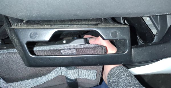 Das Hebelchen KRÄFTIG drücken und dann die Tasche nach vorne oben ziehen.
