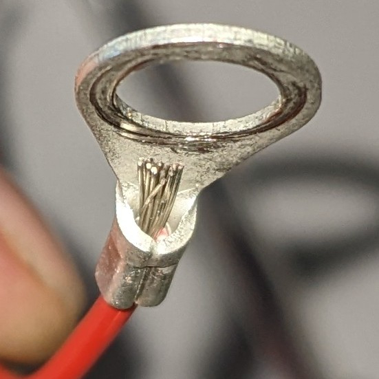 Klemmt nur die Ummantelung, Litze kontaktarm. Nachdem ich manuell die Litze an den Batteriekontakt gedrückt habe, gings. Gelegentlich muss man am Kabel wackeln, wenns wieder nicht geht. Öse werde ich erneuern.
