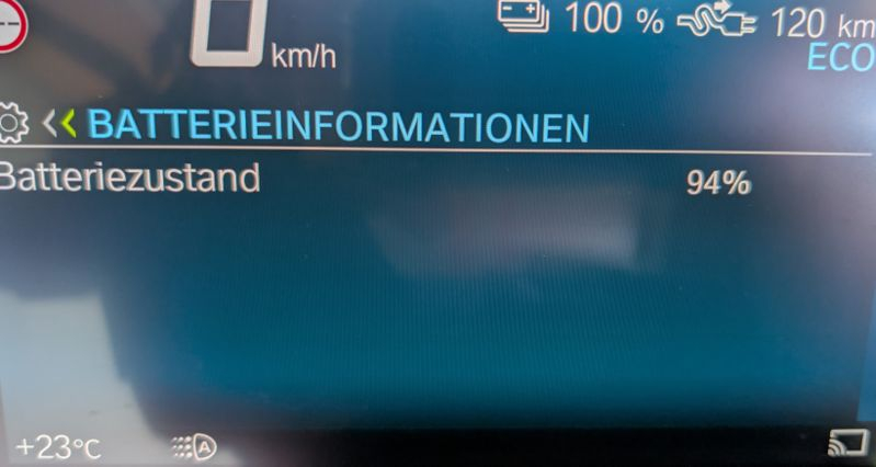 Das sieht doch gut aus, auch wenn nur 93% SOH angezeigt werden. Heute unterbrechungsfreie Runde mit der engen Held Lederjacke, Kleinstrassen überland und einige Ortsdurchfahrten mit 30er Zonen. Lockere Fahrweise mit Spass dabei. 32°C angezeigt. Kühlventilator lief meistens.