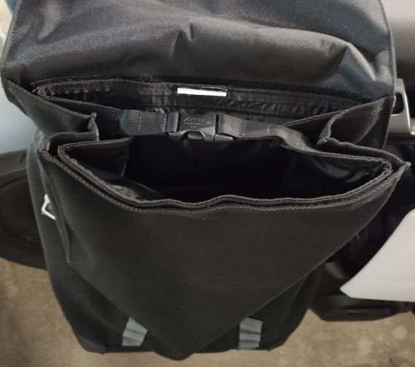 Die Tasche der NineT ("meine Tasche") ist auch sehr flexibel. Auf den Bildern bisher war sie wohl so nominal gefüllt, 14l eben. Da war das Ladekabel drin und ich habe sie mit einem Haufen Einkaufsbeuteln "aufgepolstert". Durch die Laschen kann man sie viel schlanker zusammenschnallen. Man kann sie aber auch richtig vollstopfen, für den Einkauf auf dem Nachhauseweg. Dann sind das wohl deutlich mehr als 14l und sieht noch nicht komplett daneben aus: