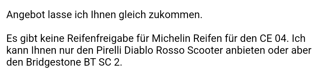 Er hat abgelehnt mir die Michelin anzubieten da nicht freigegeben für CE04.