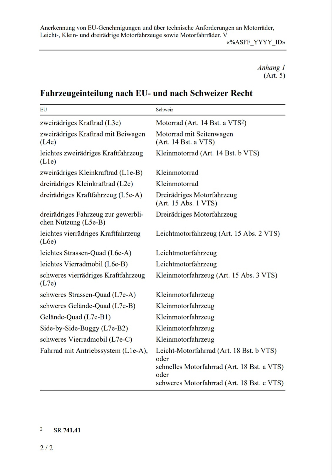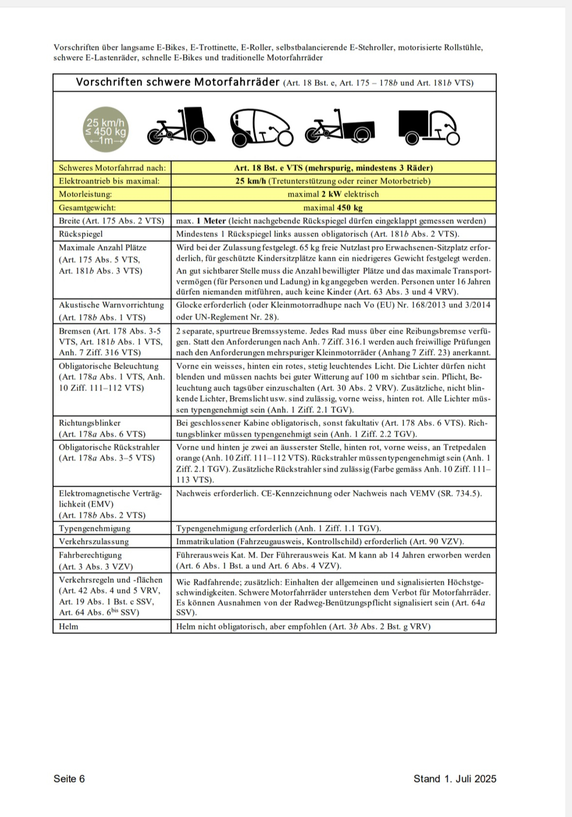 -super dass ich nun die genaue Klasse kenne. So konnte ich mir von unserem Strassenverkehrsamt bestätigen lassen, dass ich den Volta apt4 hier zu einem schweren motorfahrrad umklassifizeren lassen kann. Der Herr vom Amt war wirklich sehr Hilfsbereit, und hat mir genau erklärt, welche Papiere ich wo für was brauche.