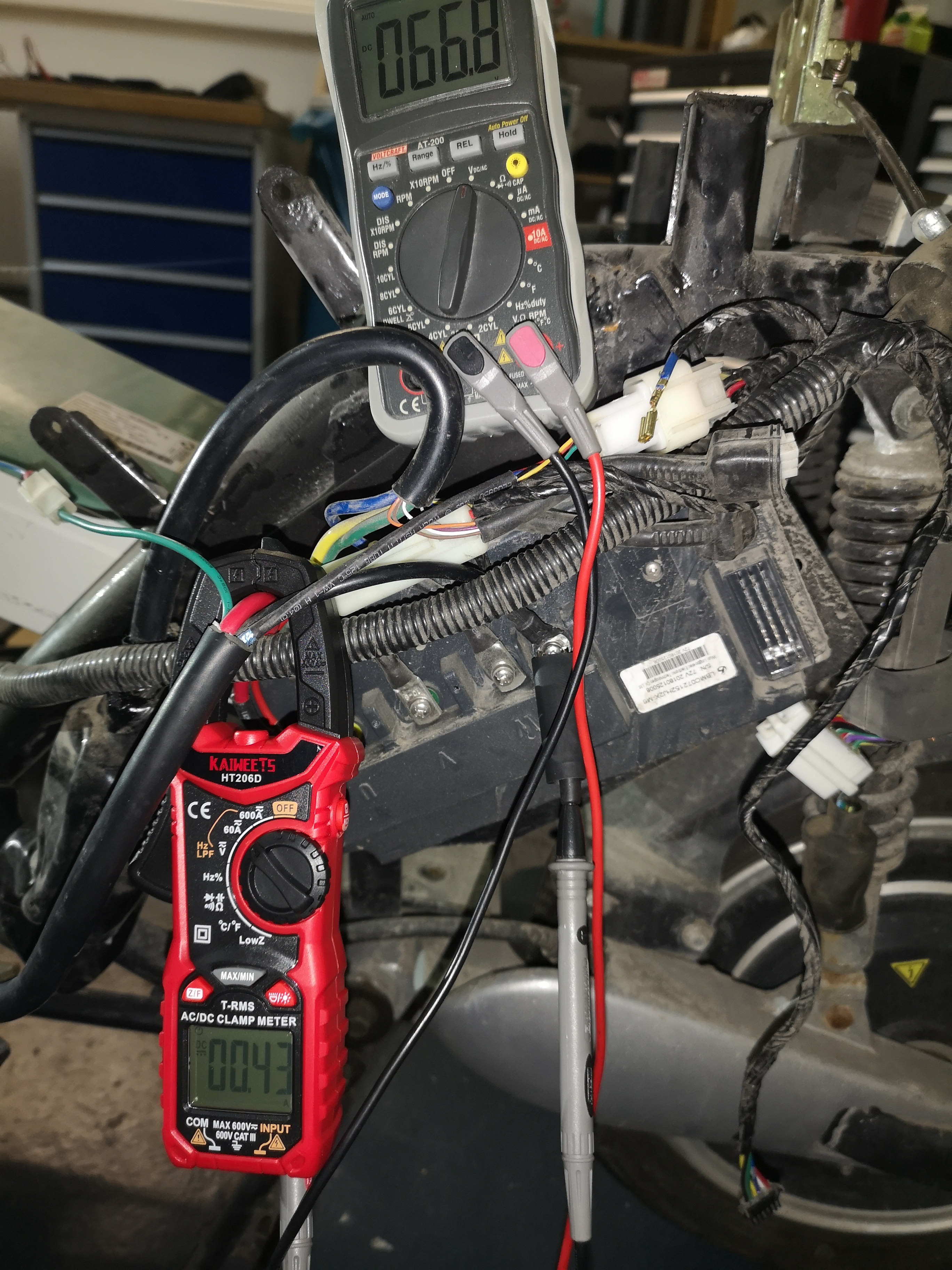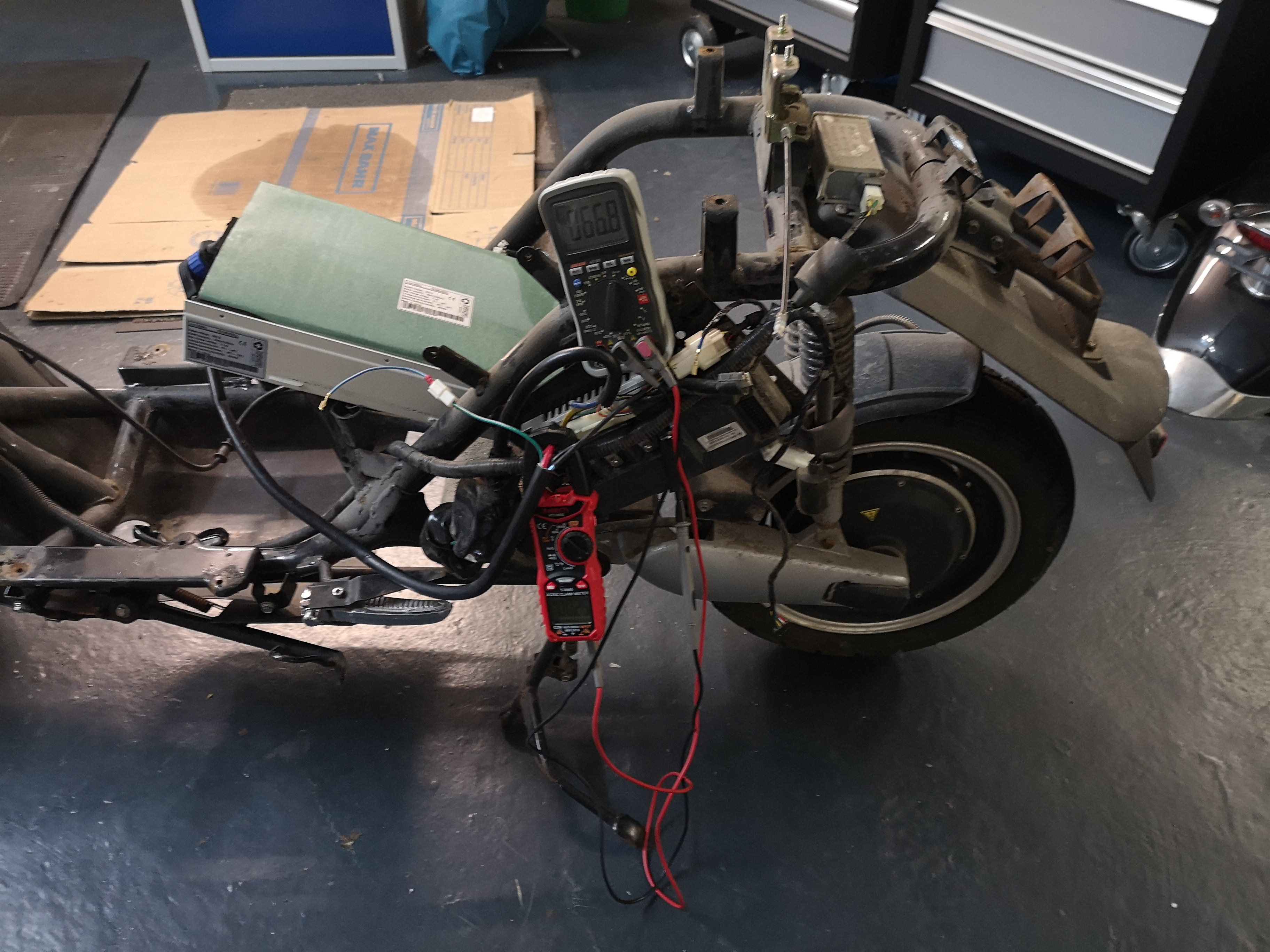 Ohne BMS läuft der Roller. Ich habe ihn aufgebockt und den Bremslichtschalter deaktiviert. Wenn ich ihn bei Vollstrom runterbremse, sinkt die Spannung und die Stromstärke steigt. Bei 50 Ampere und gut 58 Volt schaltet der Controller ab.