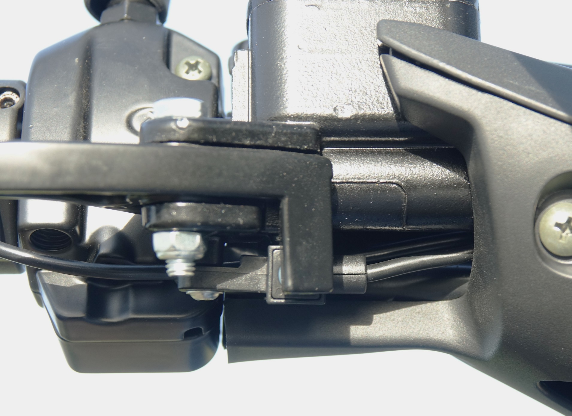 (Zwei wäre ein einfaches System, dass den Bremsdruck des rechten Betätigungshebels an beide Bremsenabgibt. Eine Hydraulikleitung würde auf ein ggf. einstellbares Verzweigungs-Ventil hindeuten)