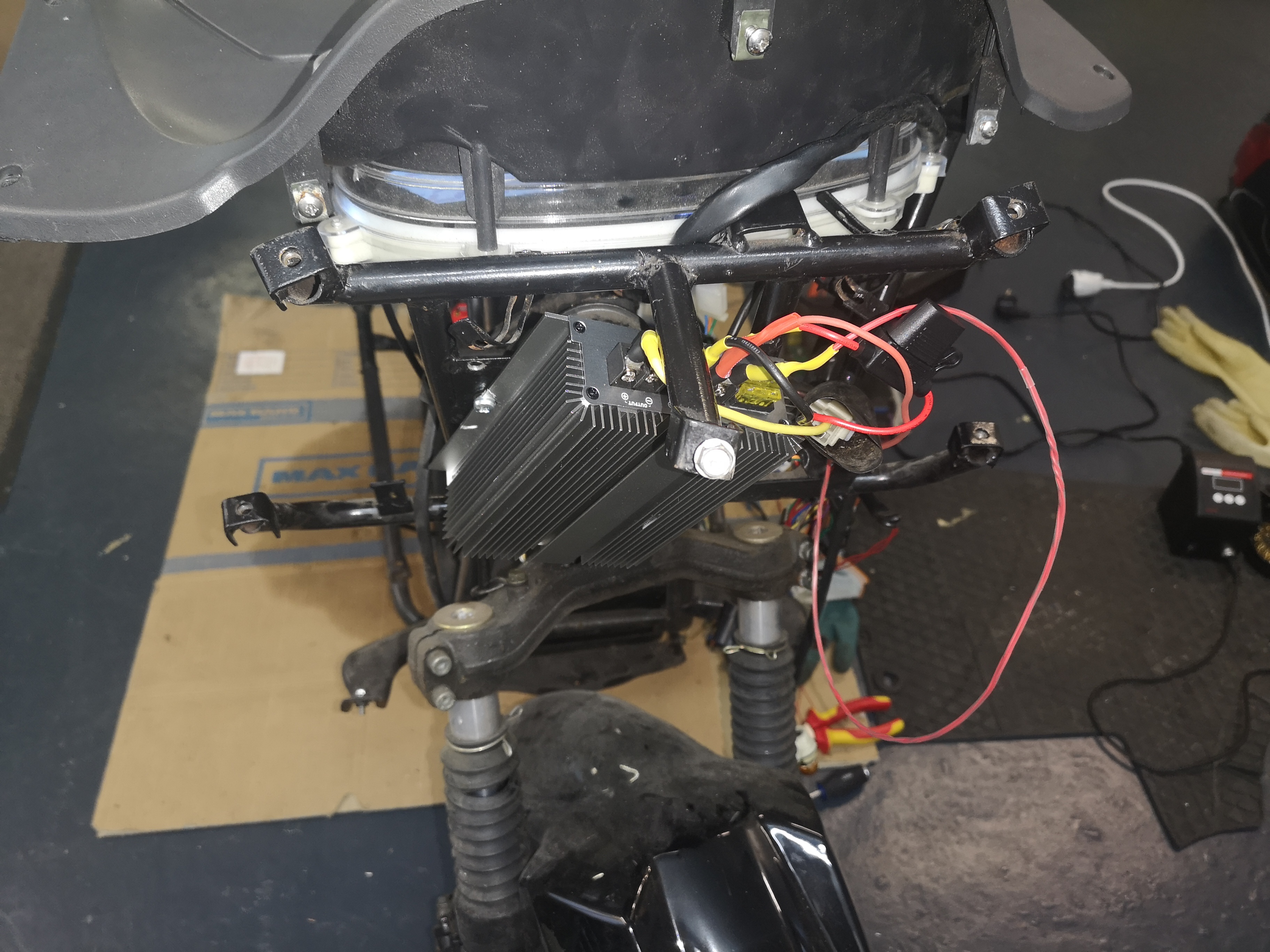 Die neuen Bauteile sind recht beeindruckend. Der Converter https://a.aliexpress.com/_msCiMxo passt grade noch vorne unter die Verkleidung Die Leistung ruft nach einer 12V-Buchse (zum Kaffeekochen).