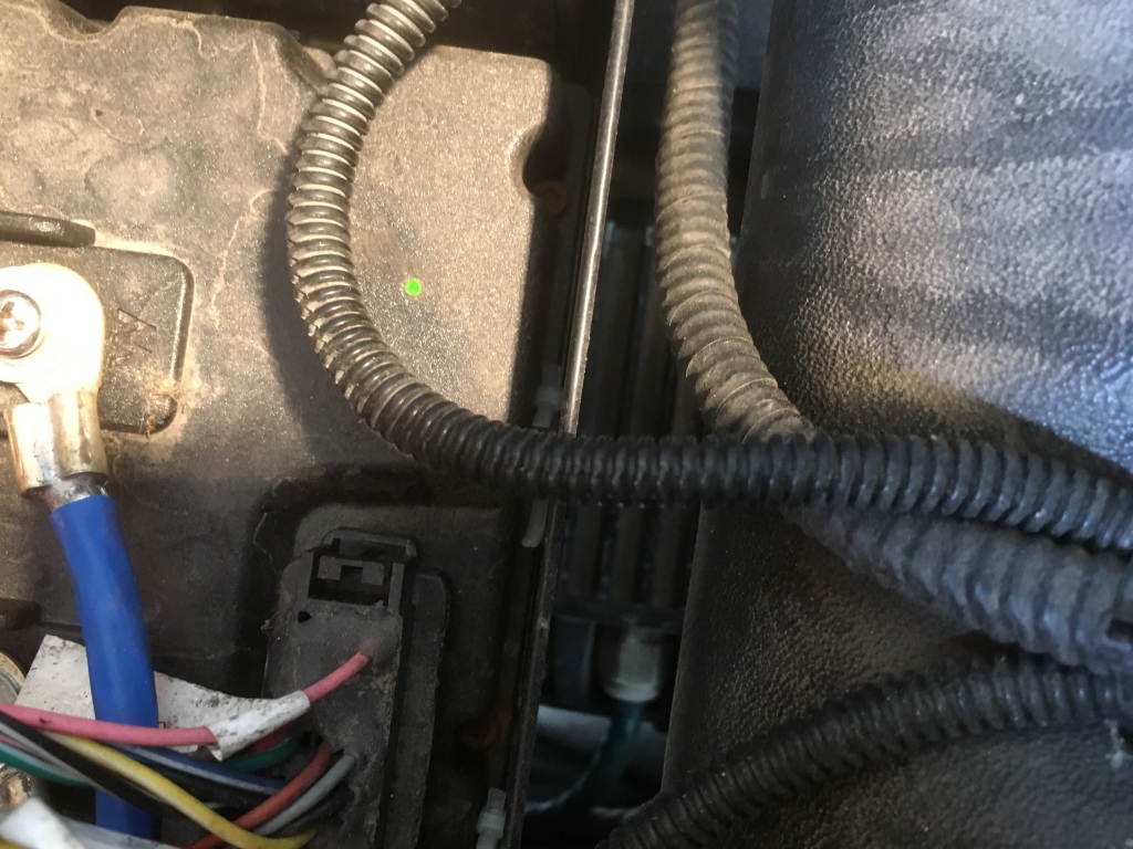 Als ich den Roller entkleidet hatte und noch alles funktionierte, begann ich wieder an den Kabeln zum Controller zu noddeln, und siehe da, auf einmal fing er grün zu blinken an (ja, auch die neueren Lingbo/Golden Motor Controller haben tatsächlich eine LED)! Und keine Reaktion mehr auf den Fahrgriff.