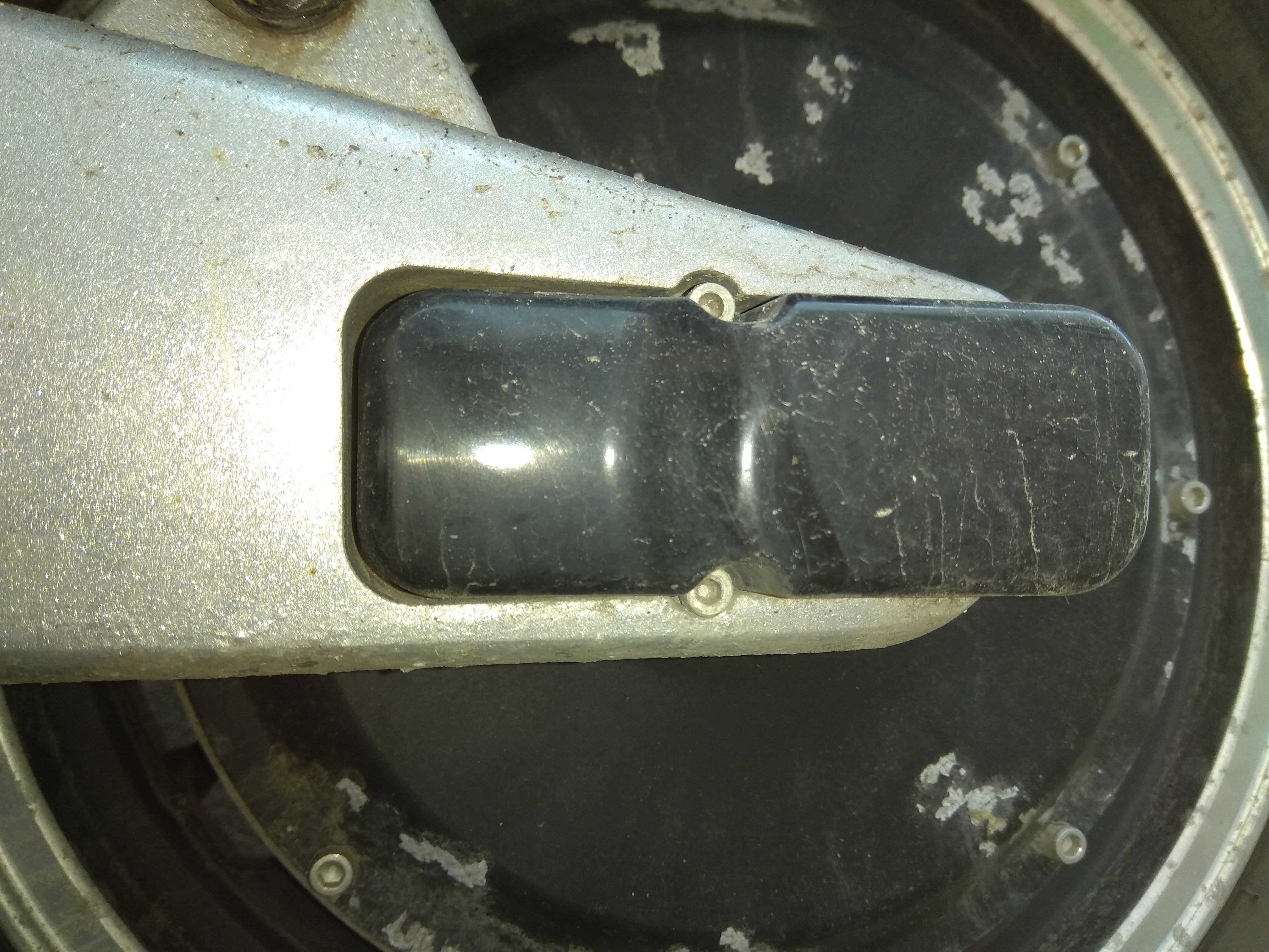 Bremse lies sich abbauen, aber auf jeder Seite zwei 3mm Imbus Schrauben, die die Abdeckungen der hinteren Welle festhalten, liessen sich nicht lockern. Nach Anwendung von reichlich WD40 habe ich bei dann beim Rausdrehversuch bei einer den Kopf abgedreht (d.h. Schraube geloest) und bei den anderen 3 nur den Kopf ausgeleiert. Ich hatte dann keine Lust mehr und habe Methode "Und bist du nicht willig, so brauch ich Gewalt angewandt" und die Abdeckungen einfach mit dem Schraubenzieher runtergehebelt. Die sind nur zur Schoenheit und haben nach hinten eh ein Loch, d.h. sie schuetzen sowieso nur vor groben Dreck. Ich werde sie einfach mit Gaffa-Tape oder aehnlich wieder festmachen.