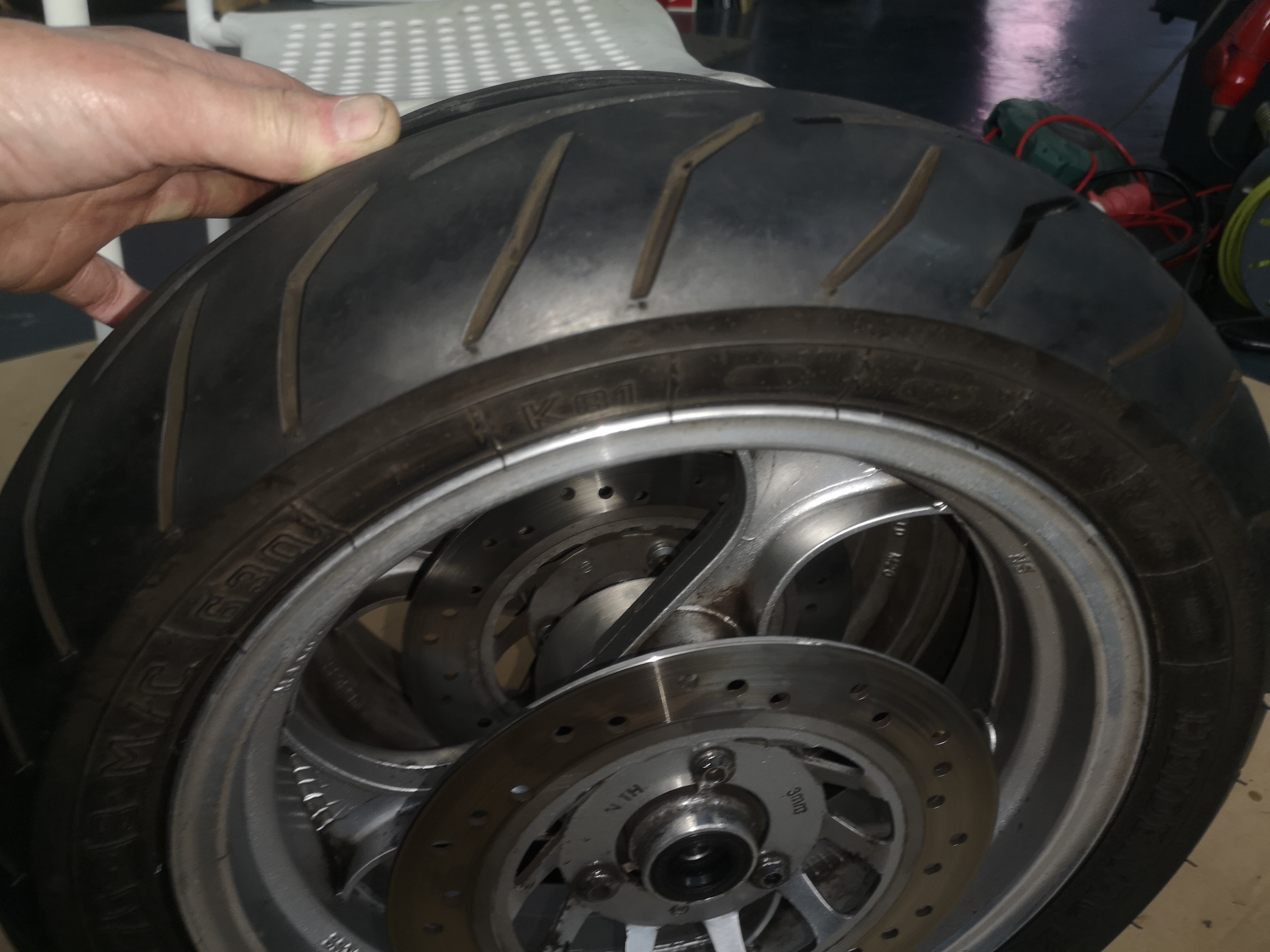 In der Realität ist der Größenunterschied verblüffend. Ich habe mal versucht, das im Bild festzuhalten. Ich habe die Räder mit den größeren Reifen aus der Unfallmaschine in den fahrbereiten Jupi verpflanzt. Hinten wird es an der Querstrebe in der Schwinge schon recht eng. Laut Trinity gibt es sogar Exemplare (oder Reifenmodelle), wo es gar nicht mehr passt – trotz Freigabe. Die praktische Messung von Tacho und tatsächlicher Fahrleistung steht noch aus.